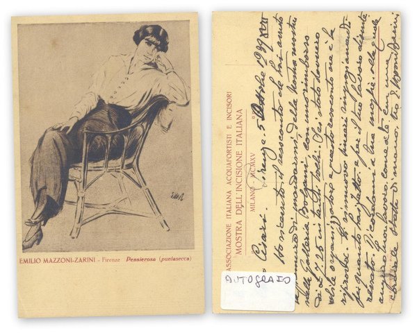 Emilio Mazzoni Zarini (1869, 1949), Cartolina con una riproduzione di una sua opera scritta e autografa spedita a Giulio Cisari.