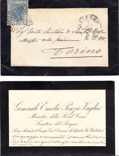 biglietto da visita manoscritto completo di busta Generale Emilio Ponzio Vaglia. Ministro della Real Casa. Senatore del Regno. primo Aiutante di Campo Gent.le Onorario del defunto Re Umberto I