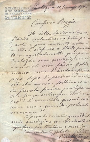 Emilio Zago. (1852 - 1929). Attore teatrale veneto. Fu grande interprete di Goldoni. Lettera manoscritta e firmata.