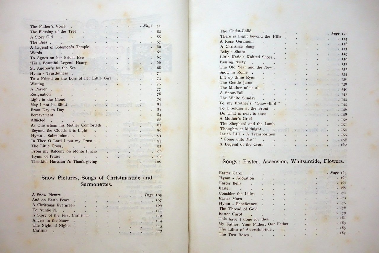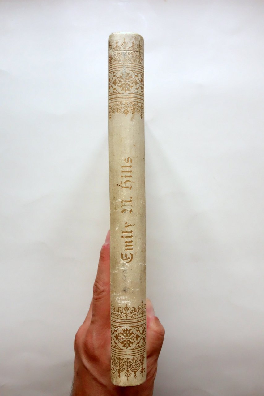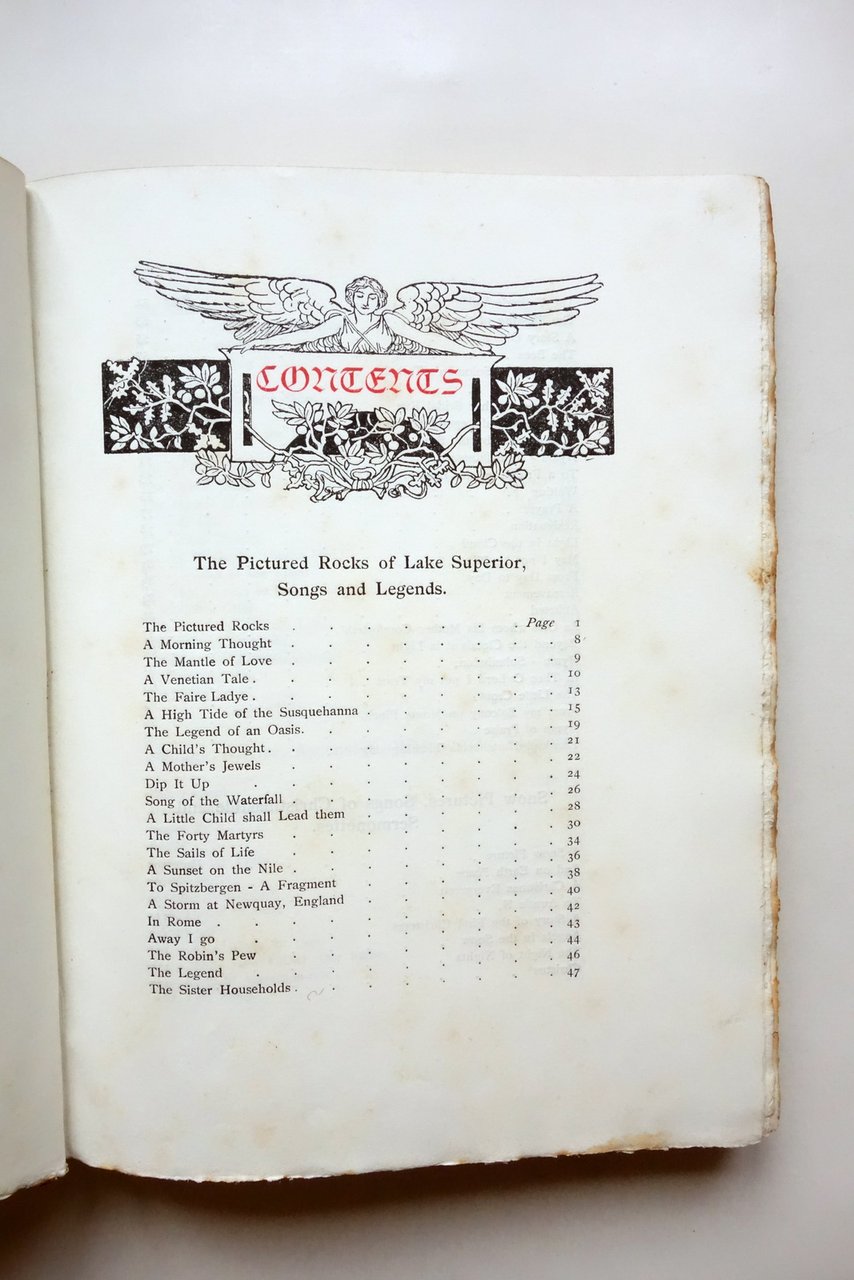 Emily M. Hills, The pictured rocks of Lake Superior and other poems C. Colombo, Roma 1904; cm 25x19; pp. [20]-266 con bei capilettera e alcuni fregi in b/n, ritratto fotografico dell'autrice all'antiporta, protetto da velina; interni in bella carta uso mano con barbe. Pregevole legatura in tutto cartonato con titolo e bei fregi impressi in oro al dorso e ai piatti. Edizione in lingua inglese. Condizioni di conservazione Buone condizioni con tracce d'uso, coperta con poche minuscole macchiette e lievi / leggerissime tracce di sporco. Interni buoni con minimo e per lo più marginale foxing. Pregiata qualità editoriale. Interni in bella carta uso mano con barbe e fregi in stile art nouveau. Per un elenco delle poesie vedi foto indice. SETT127.L24457 N