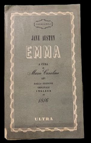 In 8°; 496, (4) pp. Brossura editoriale in cartoncino grigio con titolo in bianco e nero al piatto anteriore. Una piccolissima mancanza di carta al margine inferiore del dorso. Qualche carta leggermente brunita a causa della pessima qualità della carta utilizzata come tipico della Roma che risentiva dei fatti bellici e della situazione di estrema difficoltà. Nel complesso esemplare in buone condizioni di conservazione. Prima rarissima traduzione italiana della più rara fra le prime traduzioni italiane di Jane Austen. Nel 1945 uscirono due versioni di Emma una della Ultra e una della Caravella considerate a pieno titolo prime edizioni. Seppur ambedue le opere sono assai rare, quella edita da Ultra è senza dubbio, la più rara fra le prime edizioni italiane di Jane Austen, a tale rarità si avvicina solo, ledizione de La Caravella completa della sua sopraccoperta. Emma fu pubblicata dallautrice nel 1816 in forma anonima. Come la maggior parte dei romanzi di Jane Austen pubblicati prima degli anni 50, il volume risulta rarissimo ma questo di Ultra è di una rarità mitica. I romanzi di Jane Austen, in Italia, rimasero sconosciuti e non tradotti, fino a quando Mondadori decise di pubblicare nel 1932, con la traduzione di Giulio Caprin, Orgoglio e Pregiudizio. Il volume non ebbe particolare successo tanto che si dovette aspettare il 1945, quando il clima culturale mutato e la presenza sul territorio italiano di una forte componente anglofona, riportò in auge il nome della Austen. Nel 1945 alcune case editrici minori ma dallo spiccato spirito editoriale come appunto lAstrea, la Denti, Tariffi (che nel 1945 ripubblicò Orgoglio e Pregiudizio con il titolo definitivo italiano con il quale oggi è conosciuto), Ultra e La Caravella, decisero la pubblicazione di alcuni altri scritti della Austen che però, per le ristrettezze economiche e di materiali di quegli anni, furono editi in un numero assai ridotto di copie. Bisogna aspettare fino ai primi anni 70 per vedere, in un crescendo inarrestabile, la fama di Jane Austen aumentare a dismisura e i suoi romanzi essere apprezzati, non più solo come romanzi damore ma come veri e propri capolavori della letteratura mondiale, fino a trasformare la loro autrice una delle più apprezzate, acclamate e ristampate autrici in Italia. Proprio per questo lento successo dellautrice inglese, alcune sue opere furono tradotte per la prima volta ben dopo il 1950. Bisogna ad esempio aspettare il 1959 per vedere la prima uscita di Labbazia di Northanger o il 1961 per la prima edizione italiana di Mansfield Park e anche queste prime ma tarde, edizioni italiane risultano, oggi, rare a reperirsi. Questa prima edizione italiana di Emma si presenta nella traduzione di Mario Casalino. La più rara prima edizione italiana di Jane Austen.
