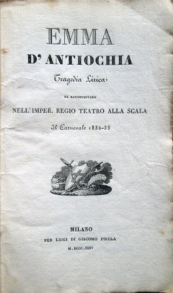 In-16° (17,6 x 10,5 cm), pp. 38, (2), copertina editoriale con titoli entro cornice decorata. Qualche normale segno d'uso e del tempo alla copertina. Alla copertina anteriore, firma d'appartenenza e data scritte da mano coeva; vignetta al frontespizio. Qualche leggero segno d'umido alle pagine, per il resto ben conservato. La première dell'opera era andata in scena al Teatro alla Fenice di Venezia l'8 marzo 1834. Musica del Maestro Saverio Mercadante. Scenografia di Baldassare Cavallotti e Domenico Menozzi. Personaggi ed interpreti: Corrado di Monferrato, conte di Tiro, Orazio Cartagenova; Ruggiero, nipote di Corrado, Antonio Poggi; Emma, principessa d'Antiochia, Giuditta Pasta, prima cantante di Camera di S. M. I. R. A.; Adelia, figlia di Corrado e sposa di Ruggiero, Rosa Bottrigari; Aladino, giovine mussulmano, schiavo di Emma, Raineri Pochini; Odetta, damigella di Adelia, Felicita Bayllou; Cori e comparse: Cavalieri, Crociati, Dame, Damigelle, Trovatori, Soldati, Paggi, Scudieri e Menestrelli. L'azione si svolge in Siria, nella città di Tiro, nel XII secolo. Musicisti. Maestri al cembalo: Giacomo Panizza e Giovanni Bajetti; Primo Violino, Capo e Direttore d'Orchestra: Eugenio Cavallini; Altri primi Violini, in sostituzione al sig. Cavallini: Giovanni Cavinati e Alessandro Migliavacca; Capi dei secondi violini a vicenda: Giacomo Buccinelli e Giuseppe Rossi; Primo Violino per i Balli: Ferdinando Pontelibero; Altri primi Violini, in sostituzione al sig. Pontelibero: Francesco De Bayllou e Giuseppe De Bayllou; Primo Violoncello al Cembalo: Vincenzo Merighi; Altri primi Violoncelli in sostituzione al sig. Merighi: Giacomo Gallinotti e Pietro Storioni; Primo Contrabbasso al Cembalo: Francesco Hurth; Altro primo Contrabbasso in sostituzione al sig. Hurth: Fabiano Ronchetti; Prime Viole: Carlo Maino e Pietro Tassistro; Primi Clarinetti a perfetta vicenda: Ernesto Cavallini e Felice Corrado; Primi Oboe a perfetta vicenda: Carlo Yvon e Giovanni Daelli; Primi Flauti: per l'Opera, Giuseppe Raboni, pel Ballo, Filippo Marcora; Primo Fagotto: Antonio Cantù; Primi Corni da caccia: Agostino Belloli e Evergete Martini; Prime Trombe: Giuseppe Araldi e Giuseppe Viganò. Arpa: Antonia Zanetti Sperati. Direttore del Coro: Giulio Cesare Granatelli; Istruttore del Coro: Filippo Luchini; Editore della Musica: Giovanni Ricordi; Vestiaristi proprietarj: Briani e Figlio, e Mondini; Direttore della sartoria: Giovanni Mondini; Capi sarti: Giacomo Colombo e Paolo Veronesi; Berrettonaro: Giosuè Paravicini; Attrezzista proprietario: Giuseppe Fornari; Direttore del macchinismo, ed ispettore all'illuminazione: Innocente Ogna; Macchinisti: Fratelli Abbiati; Parrucchiere: Innocente Bonacina; Capi illuminatori: Antonio Abbiati - Giuseppe Pozzi. Ballerini. Compositore dei Balli: Antonio Monticini; Primi Ballerini serj: Elena Schlanzowsky, Giovanni Casati; Primi Ballerini danzanti: Clotilde Rossetti, Carolina Bonalumi, Luigia Sassi, Fedele Caldi, Ippolito Philippe; Primi Ballerini per le parti: Nicola Molinari, Giuditta Bencini Molinari, Giuseppe Bocci, Pietro Trigambi, Tomaso Casati, Pietro Fietta, Carolina Casati, Elisabetta Monti; Primi ballerini di mezzo carattere e per le parti: Carlo Marchisi, Fedele Caldi, Giovanni Baranzoni, Carlo Della Croce, Antonio Caprotti, Antonio Rugali, Carlo Rugali, Francesco Villa, Giuseppe Fontana, Leopoldo Pagliaini, Bartolomeo Pincetti, Gaetano Croce, Fioravanti Boresi, Costantino Ravetta, Giovanni Battista Gramegna; Ballerine: Gesualda Montani, Gaetana Carcano, Rosalbina Braghieri, Eugenia Braschi, Silvia Angelini, Rosalia Molina, Adelaide Beretta; Imperiale Regia Scuola di Ballo. Maestri di Perfezionamento: Claudio Guillet e Anna Giuseppina Guillet; Maestro di Ballo: Carlo Villeneuve; Maestro di Mimica: Giuseppe Bocci; Allieve: Paola Ancement, Angela Morlacchi, Adelaide Volpini, Teresa Morlacchi, Carolina Conti, Adelaide Frassi, Francesca Zambelli, Camilla Brambilla, Luigia Viganoni, Antonia Visconti, Luigia Monti, Antonia Zucchinetti, Adelaide Pirovano, Virginia Rizzi; Signori: Giovanni Battista Gramegna, Pasquale Colombo, Pasquale Borri, Giuseppe De Vecchi, Domenico Senna, Paolo Meloni. Ballerini di Concerto: n° 12 Coppie.