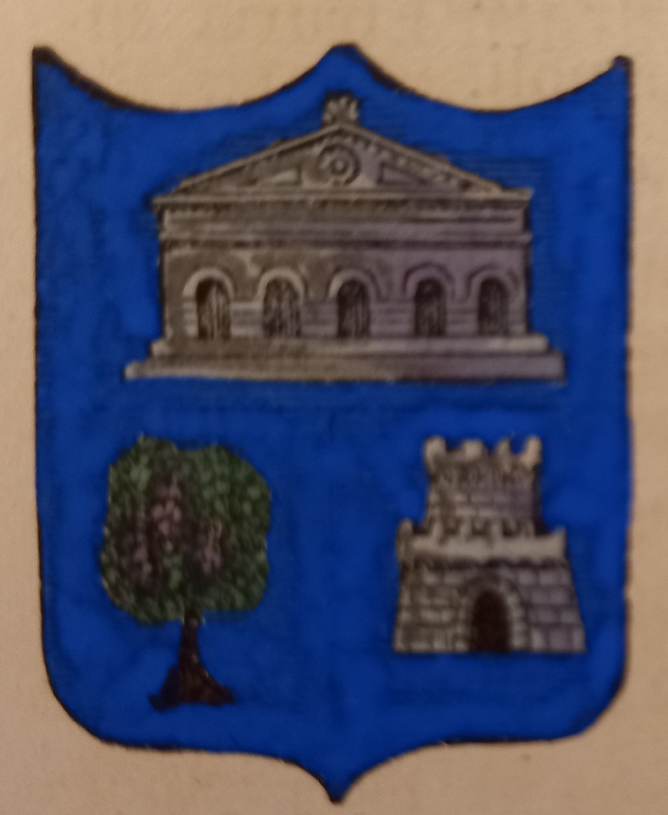 Piccolo stemma comunale colorato a mano d’epoca (cm. 3,8 x 3,2 ca.). Stralcio dal Dizionario Corografico illustrato dell’Italia, edito a Milano nel 1868. Ogni stemma di questa raccolta è inserito in una o più pagine di testo con la descrizione della località, notizie storico - geografiche e statistiche (numero degli abitanti e degli elettori, guarnigioni della Guardia Nazionale, ecc.). Spesso il testo è redatto da studiosi locali o dai sindaci, con maggiori, interessanti notizie.