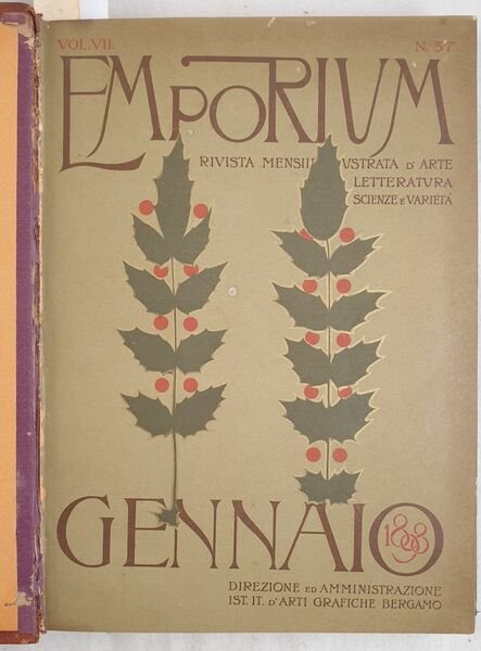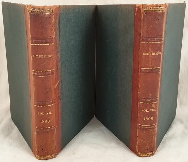 Annata completa del 1898 della celebre rivista Emporium importante sopratutto per gli originali contributi all'arte del 1800 e 1900 a cui collaborarono scrittori, gironalisti, studiosi e critici d'arte come Giacomo Lombroso, Vittorio Pica. Gli articoli presenti: Copan la citta misteriosa dell'Honduras, Alessandro Bonvicini, Beardsley Aubrey, San MArtino, Alto Biellese, Canaletto in seduta, Montanare bavaresi, Ritratto di Archibald Forbes, LA nuova casa di Herkomer, Franz Stuck, Lungo Po a Torino, Il violinaio di Cremona, Pastori della Foresta Nera, Raffet, Stemma della Famiglia dal Pozzo, Pozzo Toscanelli, Villa di Melarancio, Etnografia maschere, Evoluzione del materiale mobile delle strade ferrate (Sicilia, Gottardo), Fotografia artistica, Gabinetto nazioanle delle stampe a Roma, Laboratorio di psicologia di REggio Emilia, Falke Gustav, San gimignano, Chiesa di Sant'Agostino, Maioliche pesaresi, Mezzi idraulici, La rotonda di Brescia, La trasmissione dell'elettricita a grandi distanze negli Stati Uniti, Pesca delle perle dell'Australia, Castello Sforzesco di Milano, Sistema Prang, La genesi della MArina Americana, Colonie spagnuole: antille Filippine Caroline Canarie, L'isola di Cipro, Vincenzo Foppa, La Biblioteca di Washington, Crane Walter, Il Duca d'Aosta, Vicnenzo Foppa e le pitture nella cappella di sAn Pietro MArtire a Milano, Crane Walter, Bagni di Lucca note d'album, Battistero di Bergamo, Giacomo Leopardi, Il Teatro di Bergamo, Klonkide, Ravenna, Le ceramiche a gran fuoco di Camillo Novelli di Roma, John Ruskiun, Walt Whitman, Puvis de Chavannes Pietreo, Otto Von Bismarck, Franco Tosi, Walt Whitman ecc. Numerose illustrazioni e foto d'epoca all'interno. Copertine editoriali rilegate. In ottime condizioni. Copertina in mezza pelle con titolo e decorazioni in oro al dorso in discrete condizioni con lievi usure ai margini e dorso. Legatura in buone condizioni con rotture. All'interno le pagine si presentano in ottime condizioni con rare fioriture. Segni di tarlo ai contropiatti. In 4. Dim. 27x20 cm. Pp. 482, 498.Complete year collection of 1898 of the famous magazine Emporium with important contributes of art of 1800 and 1900 with different cooperators as writers, journalists and critical of arts as Giacomo Lombroso, Vittorio Pica. Inside Copan city of Honduras, Alessandro Bonvicini, Beardsley Aubrey, San MArtino, Alto Biellese, Canaletto in seduta, Montanare bavaresi, Archibald Forbes, New house ofi Herkomer, Franz Stuck, Lungo Po a Torino, Il violinaio di Cremona, Pastori della Foresta Nera, Raffet, Stemma della Famiglia dal Pozzo, Pozzo Toscanelli, Villa di Melarancio, Etnografia maschere, Evolution of railways (Sicilia, Gottardo), Fotografia artistica, Gabinetto nazioanle delle stampe a Roma, Laboratorio di psicologia di REggio Emilia, Falke Gustav, San gimignano, Church of Sant'Agostino, Ceramics of Pesaro, Brescia, Transmisison of electricity in USA Pearl fishing in Australia, Castello Sforzesco di Milano, Sistema Prang, La genesi della MArina Americana, Spanish colonies: antille Filippine Caroline Canarie, L'isola di Cipro, Vincenzo Foppa, The Library of Washington, Crane Walter, Il Duca d'Aosta, Vicnenzo Foppa and paintings in the chapel of sAn Pietro MArtire a Milano, Crane Walter, Bagni di Lucca note d'album, Battistero di Bergamo, Giacomo Leopardi, Theatre of Bergamo, Klonkide, Ravenna, Le ceramiche a gran fuoco di Camillo Novelli di Roma, John Ruskiun, Walt Whitman, Puvis de Chavannes Pietreo, Otto Von Bismarck, Franco Tosi, Walt Whitman ecc. Different illustrations and photoes inside. Editroial cover bound inside In very good conditions. Half leather cover with golden title and decorations in fair conditons slightly worn in the edges and spine. Binding in good conditions with cracks. Inside pages are in very good conditions with occasional foxings. Wormings in counterplates. In 4. Dim. 27x20 cm. Pp. 482, 498.