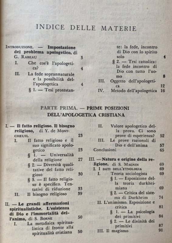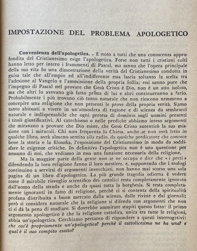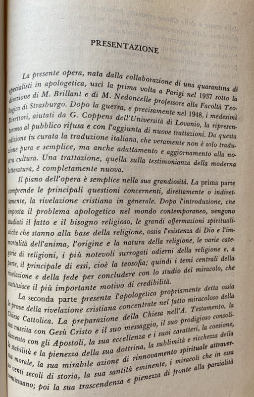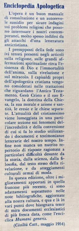 Enciclopedia Apologetica L'opera è un buon manuale di consultazione e un autorevole sussidio per sicure indagini sui problemi religiosi che possono interessare i nostri contemporanei, molto spesso indifesi dagli attacchi d'una letteratura anticristiana. I presupposti della fede sono ivi tenuti presenti negli articoli sulla religione, sulle grandi affermazioni spiritualiste circa l'esistenza di Dio e l'immortalità dell'anima, sulla rivelazione e sul miracolo. I capisaldi propri dell'apologetica cristiana vengono considerati nelle trattazioni che riguardano l'Antico Testamento, Gesù Cristo e il suo vangelo, la dottrina della Chiesa, la sua morale e azione e santità, le eresie e le chiese separate. L'attualità del cristianesimo viene lumeggiata in una particolare sezione sui fenomeni dell'incredulità e della conversione di cui si fa lo studio utilizzando i documenti e testimonianze letterarie del nostro tempo. Infine non manca un nutrito repertorio di risposte ragionate a particolari difficoltà desunte da la storia, dalla scienza, dalla filosofia, dal testo stesso della rivelazione, e da atteggiamenti culturali ormai di moda. In questa edizione, oltre i miglioramenti apportati in quella francese più recente, ci sono adattamenti soprattutto nelle note bibliografiche, aggiornate alla nostra cultura, e qua e là in vari punti dove bisognava tener di mira documenti ecclesiastici di più fresca data, come l'enciclica Humani generis. (Civiltà Catt., maggio 1954).