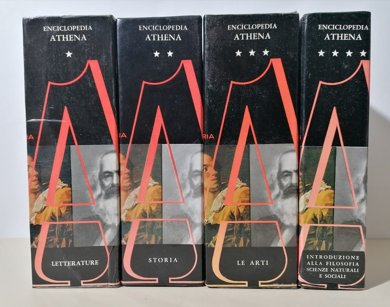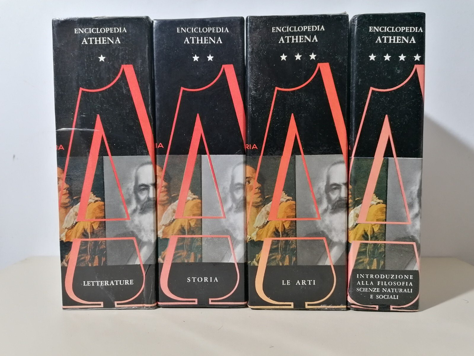 Enciclopedia Athena. De Vecchi, dal 1962 4 Volumi in altrettanti cofanetti: - Letterature - Storia - Le arti - Introduzione alla filosofia, scienze naturali e sociali Ottime condizioni a parta un cofanetto che è un po' usurato nella parte bassa (vedi foto)