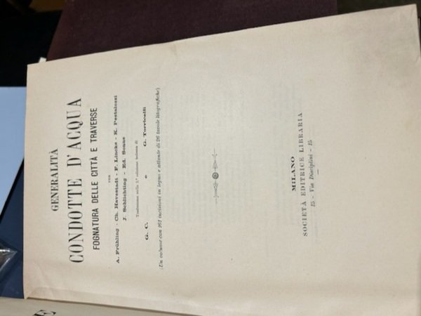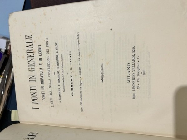 In 4∞, belle leg. in mz. perg. coeva con punte, tassello al dorso con tit. in oro impresso. Si tratta dei soli 4 Voll. di atlanti. Manca il testo. Complessive 302 tavv. litografiche pi˘ volte pieg. I vol.: 1896 - Studio dei progetti. Influenza nell'esercizio sulla scelta del tracciato. Lavori in terra e in roccia. Condotta dei lavori. XVI tavv. lit. anche a col. pi˘ volte pieg. Segue, 1893: Costruzione dei muri di sostegno e delle strade di fondazione. XXX tavv. lit. anche a col. pi˘ volte pieg. con numerazioni non conseguenziali. Segue s.d. (1893): Consolidazione delle scarpe in terra. Gallerie. XXIII tavv. lit. anche a col. pi˘ volte pieg. II vol.: 1892 - I ponti in generale ponti in muratura e in legno.XXIV tavv. lit. pi˘ volte pieg. Segue: 1892 - Ponti in ferro a travate - Ponti mobili. XXVII tavv. lit. pi˘ volte pieg. Segue: 1897 - Ponti ad arco e sospesi - Pile metalliche. XXIII tavv. lit. pi˘ volte pieg. III vol.: (1896) - Costruzioni idrauliche - Condotte d'acqua fognatura delle citt‡ e traverse. XXVI tavv. lit. pi˘ volte pieg. Segue: 1896 - Costruzioni idrauliche riguardanti la navigazione interna e l'agricoltura. XXVI tavv. lit. pi˘ volte pieg. Segue: 1897 - Costruzioni marittime. XXX tavv. lit. pi˘ volte pieg. IV vol.: (1896) - Macchine motrici trasmissioni macchine per elevare l'acqua draghe, battipali. XXIII tavv. lit. pi˘ volte pieg. Segue: 1896 - Mezzi per effettuare il trasporto dei materiali da costruzione e per l'esecuzione di edifici ed opere d'arte . XXIII tavv. lit. pi˘ volte pieg. Segue: 1897 - Estrazione e lavorazione delle pietre. Macchine ed apparecchi per lavori subacquei, sollevamento pesi, . XXVII tavv. lit. pi˘ volte pieg. Segue: 1894 - Appendice - Elettrotecnica IV tavv. lit. pi˘ volte pieg. Bella conservaz.
