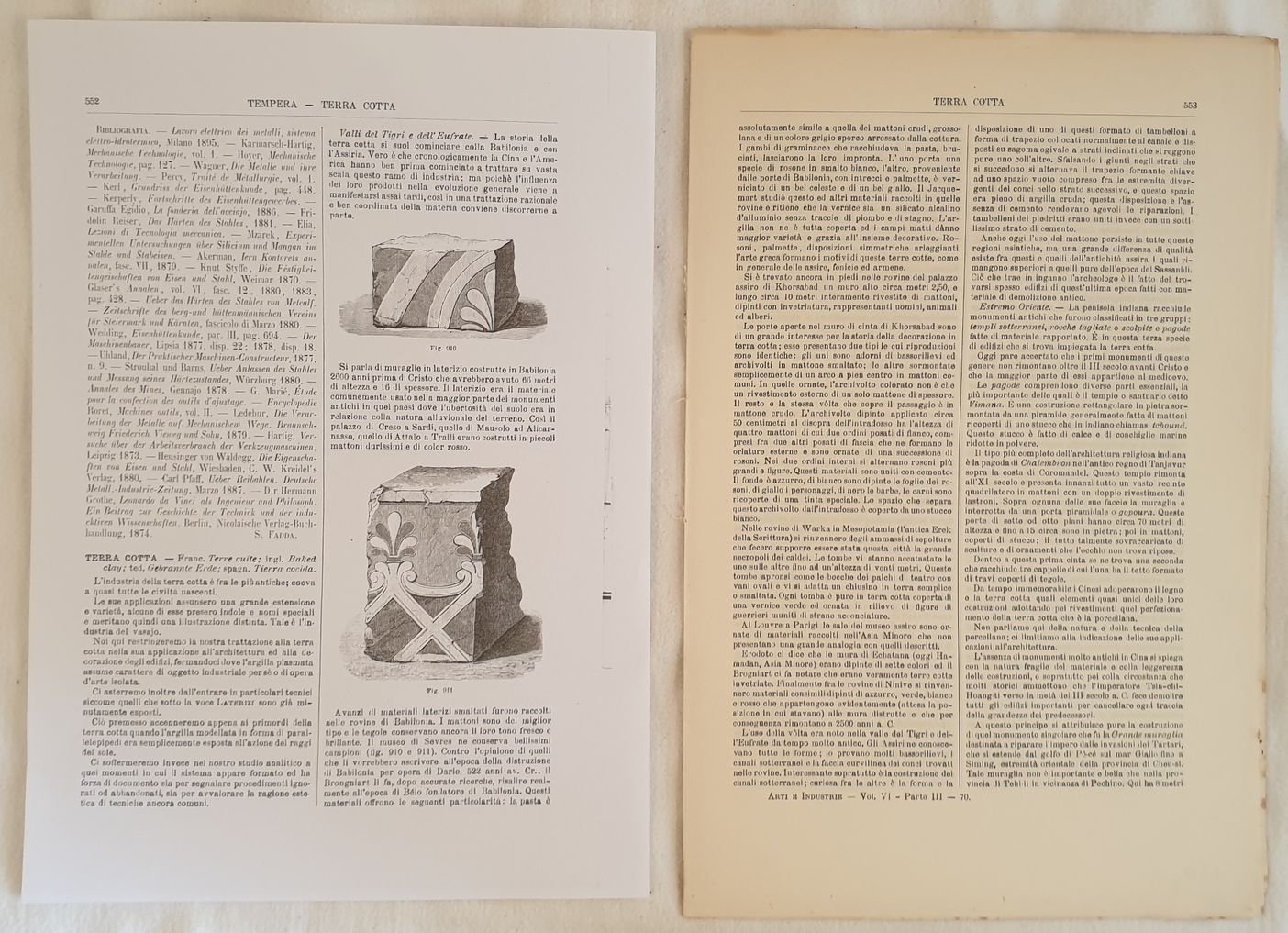 Interessante estratto del 1890 circa tratto dall'Enciclopedia delle arti e industrie edita da Utet sulla terracotta. La parte relativa alla terracotta inizia da pag. 552 e consta di 15 pagine All'interno descrizione per la lavorazione della terracotta. Prima pagina di testo mancante, viene fornita una fotocopia. In ottime condizioni. Copertina assente. Legatura in buone condizioni. All'interno le pagine si presentano in ottime condizioni con rare fioriture. Pagina 552 mancante. In 4. Dim. 31x21 cm. Pp. da 552 a 566. Interesting extract of 1890 from Enciclopedia delle arti e industrie edited by Utet about terracotta. The part relating terracotta begins from pag. 552 and is made up of 15 pages. Inside description of working of terracotta. First page of text is missing, we provide a photocopy. In very good conditions. Cover is missing. Binding is almost missing. Inside pages are in very good conditions with occasional foxings. Page 552 is missing. In 4. Dim. 31x21 cm. Pp. from 552 to566.