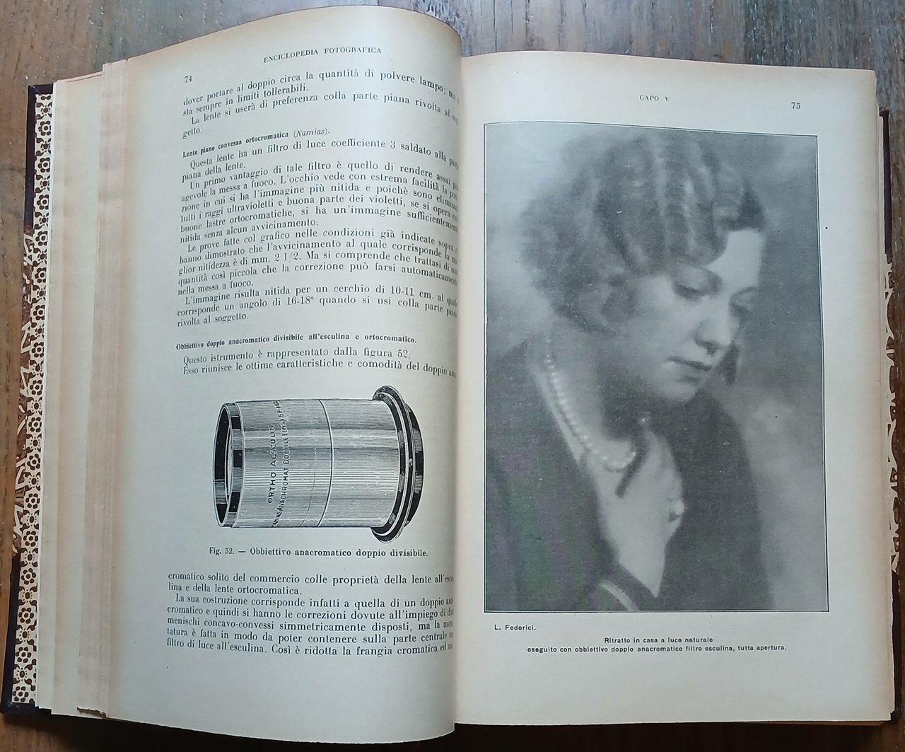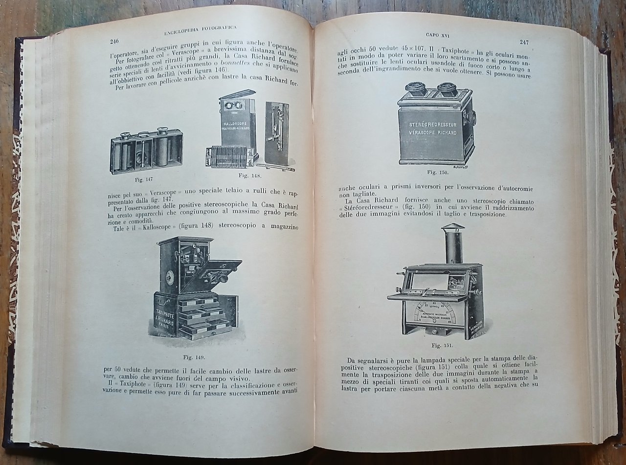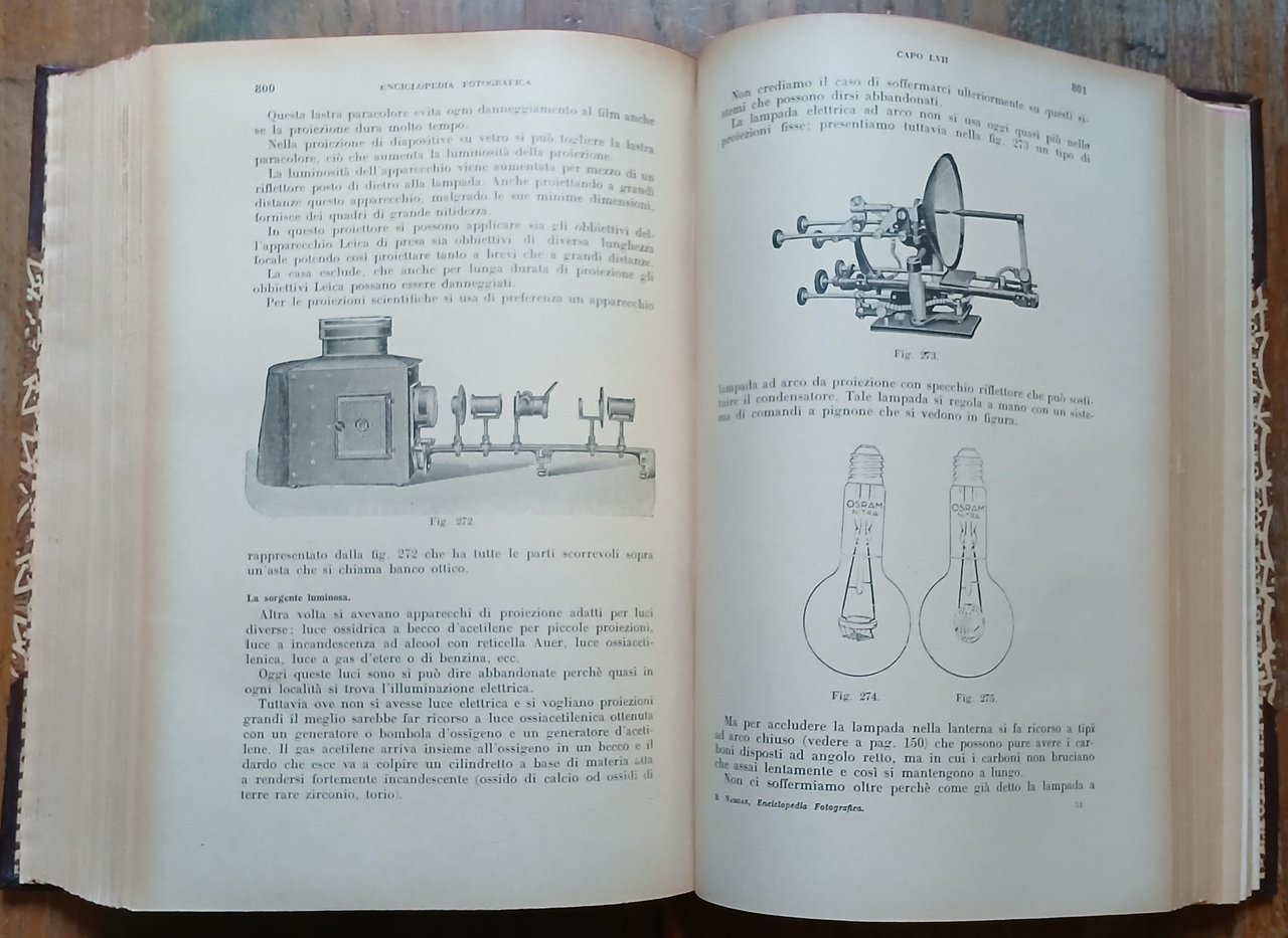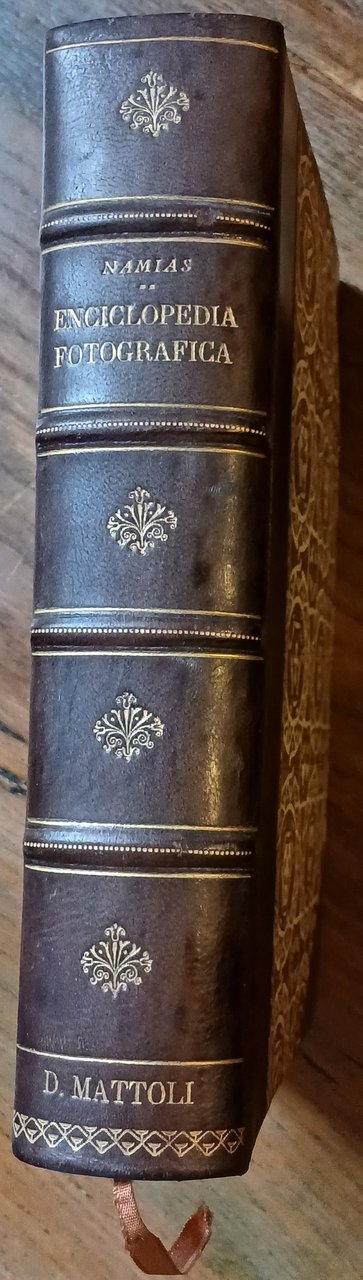 (Fotografia - Tecnica fotografica - Cinematografia) In 8°, legatura coeva in mezza pelle con punte, dorso a 4 nervi con titoli, filetti e fregi impressi in oro, carta decorata a due colori ai piatti, taglio di testa rosso, guardie in carta ornata a motivo floreale, segnalibro in tessuto, pp. (XXVIII),991,(17), con centinaia di illustrazioni in nero nel testo ed in fine pp. XLIV di pubblicità commerciale con una tavola a colori fuori testo. Edizione a cura del periodico "Il Progresso Fotografico", nona edizione - 41°-45° migliaio, finito di stampare il 30 luhlio 1934. Ottimo stato di conservazione.
