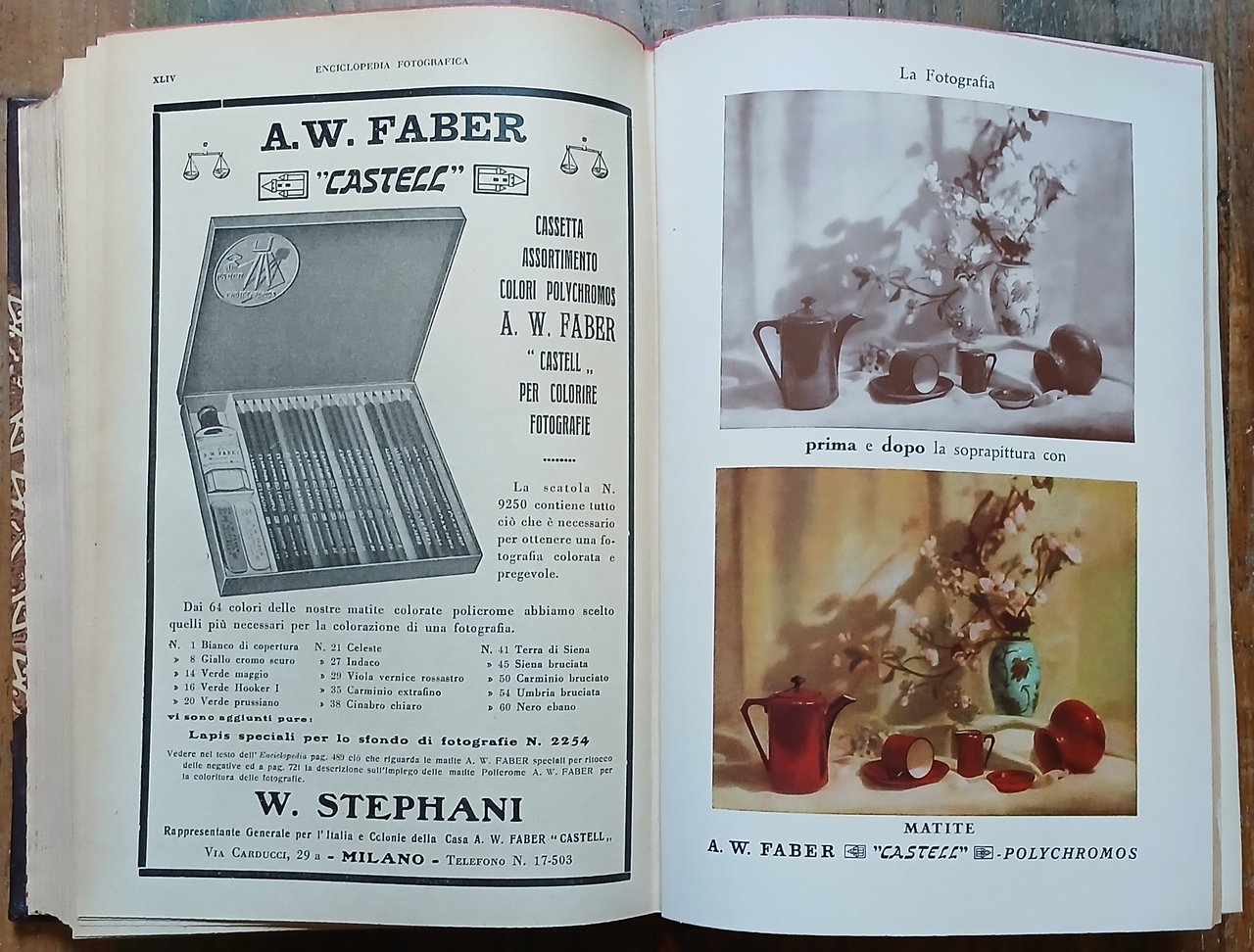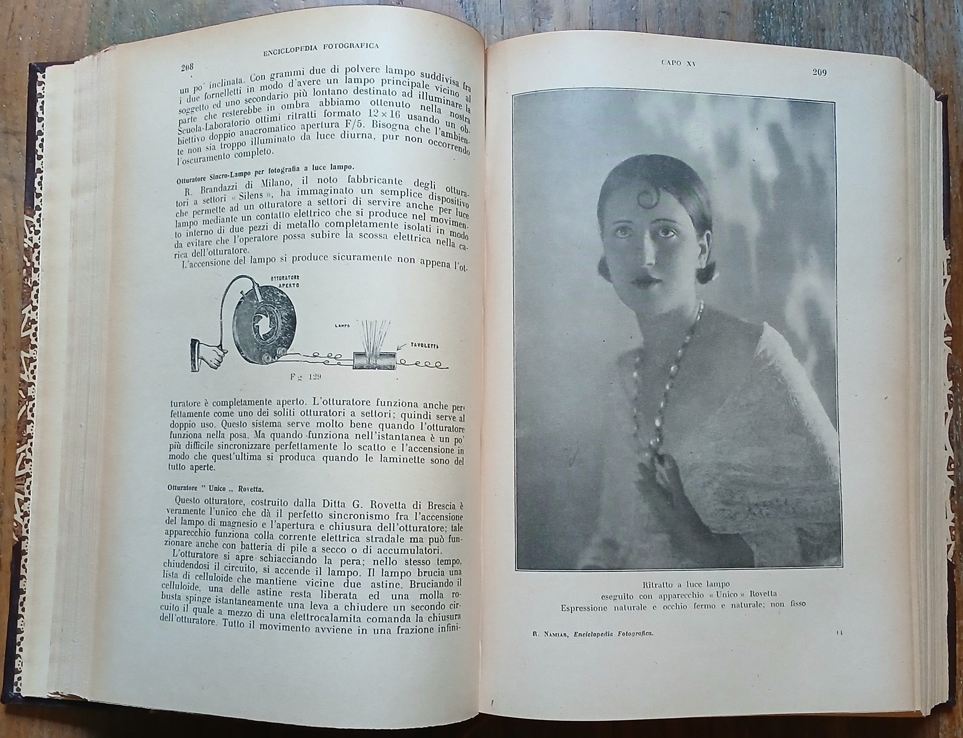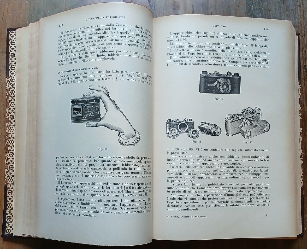 (Fotografia - Tecnica fotografica - Cinematografia) In 8°, legatura coeva in mezza pelle con punte, dorso a 4 nervi con titoli, filetti e fregi impressi in oro, carta decorata a due colori ai piatti, taglio di testa rosso, guardie in carta ornata a motivo floreale, segnalibro in tessuto, pp. (XXVIII),991,(17), con centinaia di illustrazioni in nero nel testo ed in fine pp. XLIV di pubblicità commerciale con una tavola a colori fuori testo. Edizione a cura del periodico "Il Progresso Fotografico", nona edizione - 41°-45° migliaio, finito di stampare il 30 luhlio 1934. Ottimo stato di conservazione.