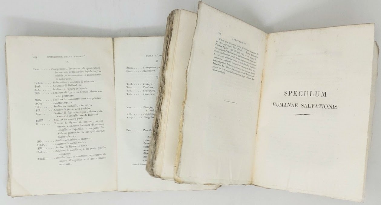 >2 vol. (su 28 che si pubblicarono dal 1817 al 1824), in-8, pp. (10), 355, (5); (4), 354; broch. edit. con bordura silogr. (dorsi restaurati). Dedica a Maria Luigia duchessa di Parma. Trattasi del primo vol. di ciascuna delle due parti, i cui volumi, secondo quanto si dice nell'avviso ''Agli Amatori delle Belle Arti'', verranno pubblicati alternatamente (la prima parte conterrà il dizionario degli artisti, la seconda sarà dedicata alla grafica). L'opera, curiosamente non registrata dai vari repertori bodoniani (ma solo ricordata da Brooks in nota al n. 1180), secondo Schlosser-Magnino (p. 485 e 509), invece, era già stata impressa dal Bodoni nel 1794 in 8 volumi e la seconda edizione apparirà in 28 vol. dal 1817 al 1824. Cicognara (n. 65) ci informa che nel 1820 i volumi già pubblicati erano 6. Lo stesso Zani, nell'opera ''Materiali per servire alla storia dell'origine e de' progressi dell'incisione in rame e in legno'' (1802) alle pp. 201-214 parla di questo suo lavoro dicendo di averne pubblicato il ''Prodromo'' dodici anni prima (cioè intorno al 1790). Esempl. a pieni margini, con barbe.