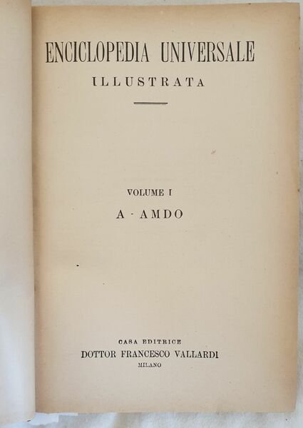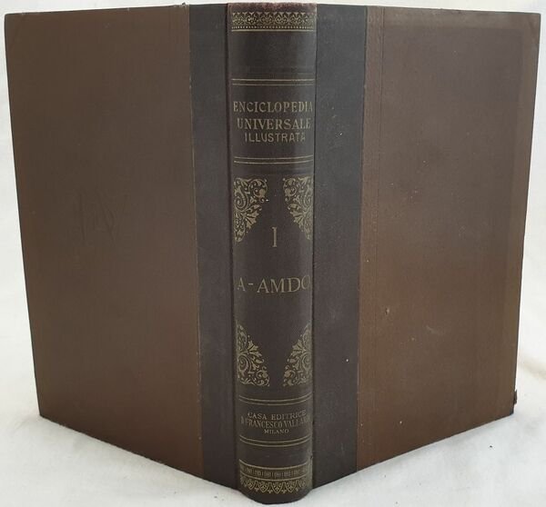Edizione del 1953 dell'Enciclopedia universale illustrata Vallardi. Siamo in possesso del volume primo solamente con le lettere A-AMDO. All'interno numerose illustrazioni e tavole fotografiche (cellule, strumenti scientifici come calcolatori, macchine da scrivere, anatomia umana, palloni aerostatici, mappe, cultura africana con statue e oggetti, macchine di agricoltura, Agrigento, Aja, alghe, Alpi, Altare, Amalfi ecc. Copertina in tela in buone condizioni con lievi usure ai margini e dorso. Legatura in buone condizioni. Pagine in buone condizioni con rare fioriture. In 8. Dim. 26x19 cm. Pp. (6)+504.Edition of 1953 of Enciclopedia universale illustrata Vallardi. We only have the first volume containing letters A-AMDO. Inside different illustrations an dphotographic plates (cells, scientiphic instruments as calculators, typing machines, human anatomy, aerostatic balloons, maps, african culture with items and statues, agriculture machines, Agrigento, Aja, seaweeds, Alps, Altare, Amalfi ecc. Copertina in tela in buoen condizioni con lievi usure ai margini e dorso. Legatura in buone condizioni. Pagine in buone condizioni con rare fioriture. Cloth cover with gilted decorations in the spine in goodconditions lightly worn in the extremities. Biding in good conditions. Pages in good conditions with occasional foxing. In 8. Dim. 26x19 cm. Pp. (6)+504.
