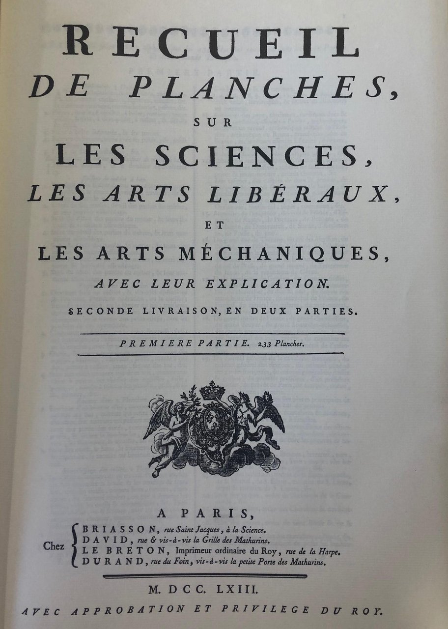 Enciclopédie de diderot et d'Alambert. Recueil de planches, sur les sciences, les arts liberaux, et les arts mécaniques, avec leur explication.Seconde livraison, en deux parties. PREMIERE PARTIE. 233 PLANCHES.