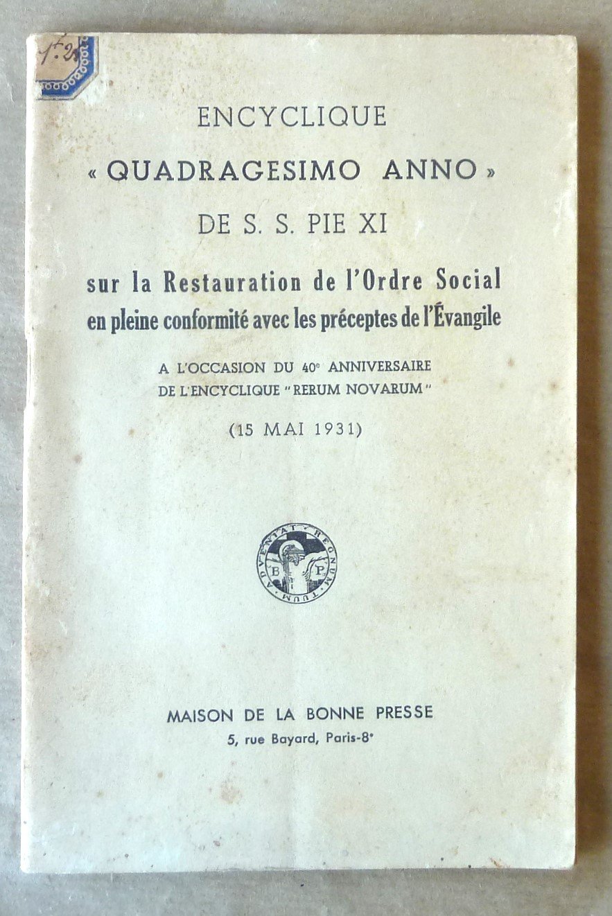 Encyclique "Quadragesimo Anno" de S.S. Pie XI sur la restauration de l'ordre social en pleine conformité avec les préceptes de l'Evangile (15 Mai 1931).