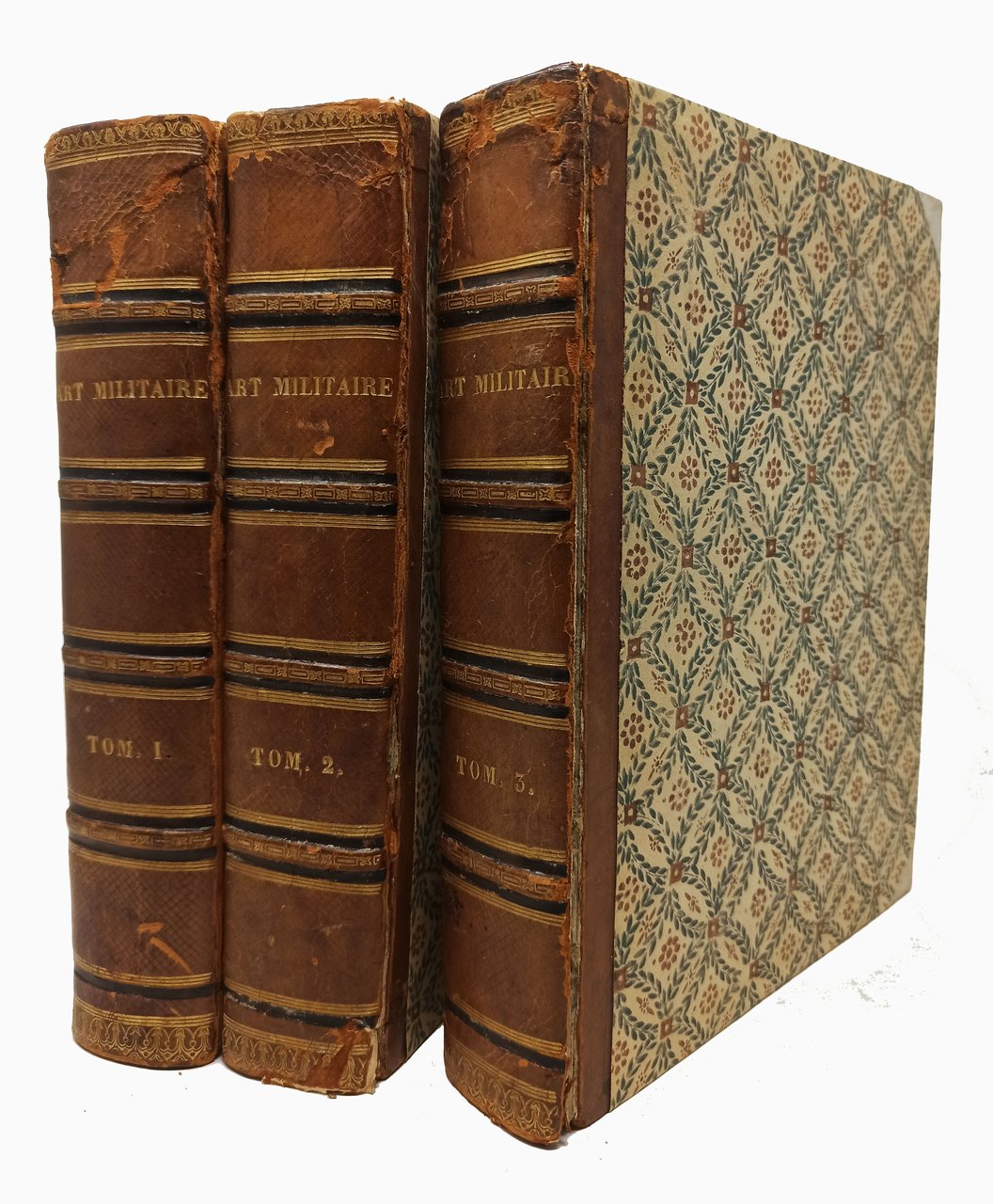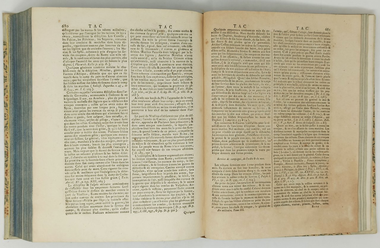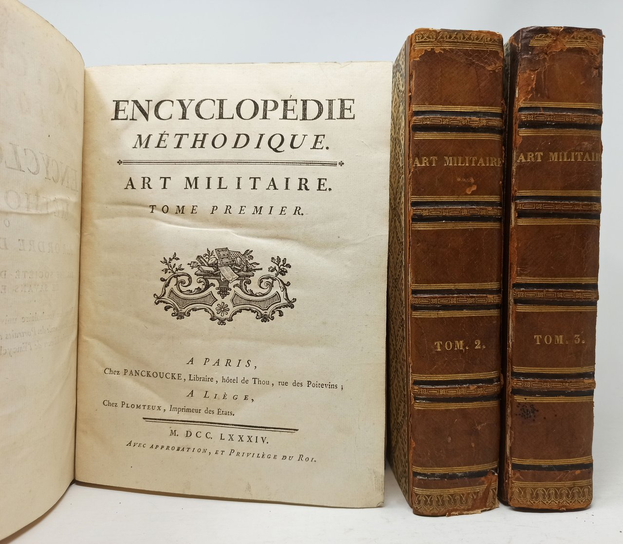 Editore: A Paris, chez Panckoucke, Libraire; A liège, chez Plomteux. Anno: M.DCC.LXXXIV - M.DCC.LXXXVII (1784 - 1787). Testo in lingua francese, stampato su due colonne. Pagine numerate: VIII + 783 (tome premier); 800 (tome second); 753 (tome Troisieme). Dimensioni di ciascun tomo: 21 x 26,5 cm circa. Stato di conservazione: I tre volumi presentano segni di usura sui dorsi in pelle (essi presentano rotture e tagli come, si può notare, dalle fotografie). Si tratta, nel complesso, di tre esemplari decisamente ben conservati. Da segnalare ordinarie macchioline marroni su alcune pagine e qualche sporadica minuscola mancanza sul margine bianco di qualche pagina. Da segnalare anche che qualche pagina dei tre voumi (una quarantina in totale, circa) si sono scurite e si presentano di color marroncino. Non sono presenti strappi, mancanze, timbri o firme d'appartenenza, scritte o altri segni nel testo. Scendendo nel dettaglio, segnaliamo: TOMO I: presenta una minuscola mancanza sull'angolo inferiore di 4 fogli in totale (quelle contenenti le pagine 53-54, 75-76, 247-248 e 309-310); un minuscolo forellino (su una parte di testo) sul foglio che contiene le pagine 741-742 (la ettura e la comprensione del testo non sono compromesse date le dimensioni minuscole del forellino). TOMO II: Presenta una minuscola mancanza sul margine bianco di 5 fogli in totale (quelli contenenti le pagine 203-204, 351-352, 675-676, 45-446, 525-526); un errore di stampa che riguarda il numero della pagina 211 (che è stato modificato in '159' ma l'errore riguarda esclusivamente la numerazione in quanto il testo della la pagina è quello corretto). TOMO III: una piccola mancanza sul margine inferiore del foglio che contiene le due pagine 221-222 e del foglio che contiene le due pagine 259-260 e 361-362. Da alcune ricerche effettuate, credo che l'opera comprendesse anche un quarto volume di tavole (un atlante) pensato come supplemento che, in questo lotto, NON è presente. La parte di testo è COMPLETA (consta di questi tre volumi che vanno dalla A alla Z). La parte militare fu scritta principalmente da Louis Keralio, professore di tattica alla Scuola Militare dal 1769, autore del Discorso Preliminare.