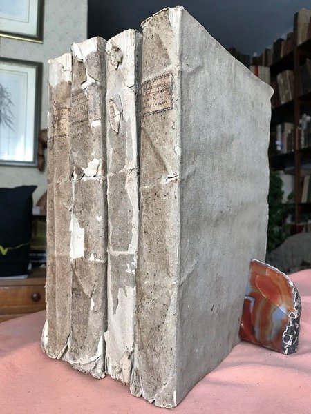 Due Tomi, ciascuno suddiviso in due Parti, legati in quattro volumi, in folio antico, brossura coeva (mende), titoli al tassello al dorso, sguardie, occhielli, frontespizi (4, uno per ogni parte/volume), prefazioni, numerazione continua per i due volumi di ogni tomo: XI, 415 - 779 (1); (2) 394 - 781 (1) pp. Bella vignetta incisa in rame a ciascun frontespizio (inc. da Alessandri e Scattaglia) con raffigurazione allegorica del Tempo, seduto su di un prato con una clessidra in mano, e di due putti, uno dei quali sorregge un libro su cui l'altro putto intento a scrivere. Testatine incise su rame ad arabesco, testo in doppia colonna. Rara edizione padovana di questa monumentale opera (206 volumi editi fra il 1782 e il 1832 da Charles Joseph Panckoucke e da sua figlia, Thrse-Charlotte Agasse), una grandiosa rielaborazione della famosa Encyclopdie di Diderot e dAlembert. Ogni Sezione a se stante, questa di Chimica, Farmacia e Metallurgia composta da 4 Tomi (divisi in 8 volumi) di cui presentiamo qui i primi 2 Tomi (divisi in 4 volumi). Pur essendo lopera mutila, gli argomenti sono trattati nella loro intierezza, e la parte di chimica in particolare (a partire dalla prefazione di Morveau nel primo volume) un testo chiave del passaggio dalla chimica del flogisto alla nomenclatura di Lavoisier. Sono ampiamente trattati argomenti molto interessanti come ad esempio quello dellAlchimia: con la storia di essa presso ciascun popolo dagli albori alla fine del XVIII secolo, con le notizie storico biografiche degli autori che nei secoli ad essa si sono dedicati (1 Tavola Cronologica di 7 pagine con elenco e notizie degli autori della Filosofia Ermetica dal 1996 a.C. al 1739 d.C), con la storia degli Alchimisti e del loro lavoro, esoterismo e speculazioni sulla Pietra Filosofale. Ma moltissimi sono gli argomenti trattati, dallanalisi dellacqua, dei minerali, alla composizione degli Alimenti, la Fermentazione (vino, liquori, birra e non solo), piante aromatiche ed officinali, ma anche pietre preziose e ovviamente metalli, insomma, innumerevoli succulente notizie, per ciascuna voce vengono esposte generalit, specifiche, esperienze ed esperimenti, misurazioni, tabelle, ricette, notizie storiche, geografiche e bibliografiche (sono riportate anche intere Memorie). Esemplare genuino e con pochi segni d'uso, unica menda una gora (dinchiostro?) al margine inferiore del quarto volume e che interessa maggiormente la sguardia, il frontespizio e le prime due carte, tracce di gora (1 cm.) anche al margine bianco delle ultime carte del primo volume. Nel complesso opera in pi che buono stato, ampi margini, ottima inchiostratura, carta forte e frusciante. Reperto importante e raro, la sua reperibilit quasi nulla.