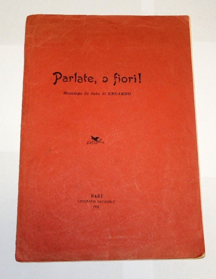 Engardo, Parlate, o fiori! Monologo da sala, Tipografia nazionale, Bari 1910, pp. 11, cm 24, br. ed. Pubblicazione molto rara. Dorso lievemente strappato, fioriture.