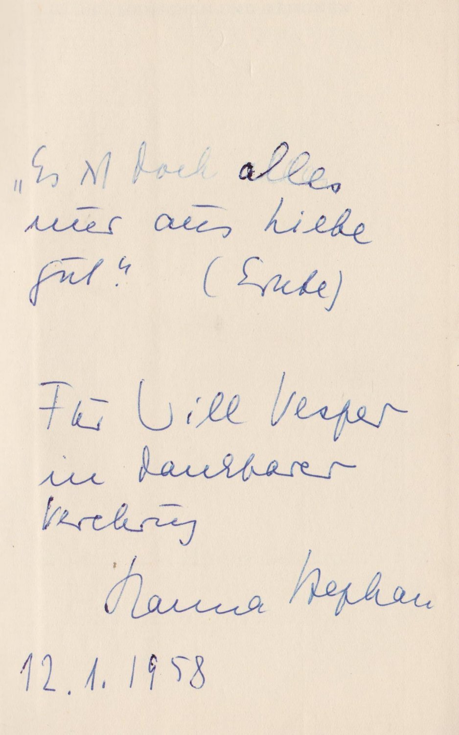 Das Buch enthält auf dem Vorsatz eine mehrzeilige Widmung und Signatur der Autorin für den Schriftsteller Will Vesper.