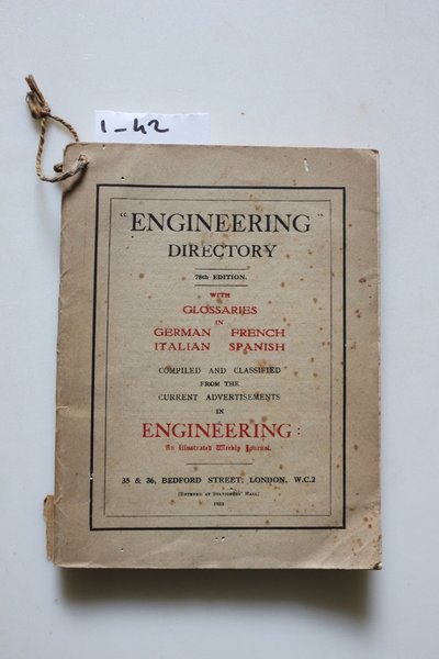 Elenco dei principali fornitori mondiali di macchinari e materiali per l'ingegneria dell'epoca. Uno spaccato interessante dell'industria fra le due guerre - DETTAGLIO DELLE CONDIZIONI : La presenza di un laccio per appendere il volume lascia intuire che lo stesso venne utilizzato praticamente dall'originario proprietario. Oltre alla rarità del volume questo particolare lo rende interessante - (1.I.7).