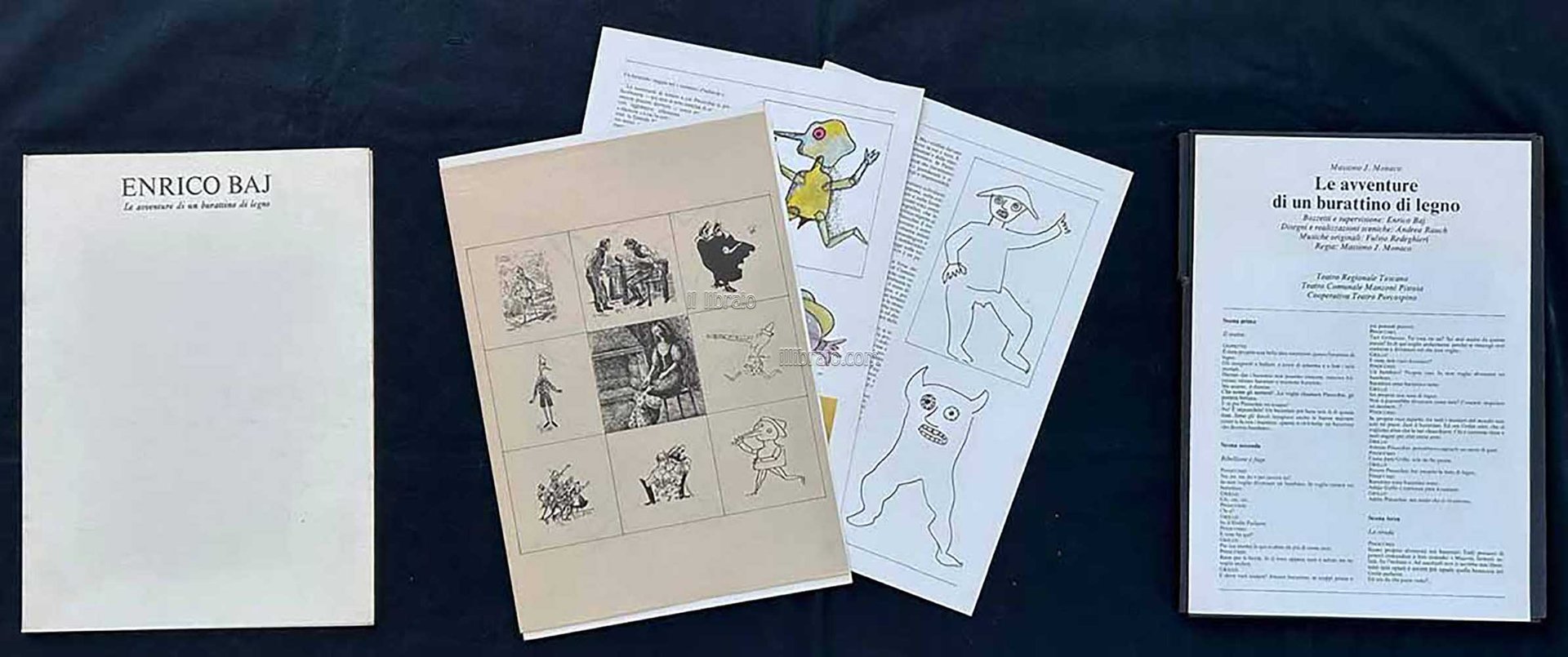 in 4°; pp. 28 a quartini sciolti (ill. bn. e col.); br. in cartoncino in formato di cartellina. Con 55 illustrazioni, di cui 13 a colori, dalle realizzazioni sceniche di Andrea Rauch, bozzetti e supervisione di Enrico Baj. Scritti di Massimo J. Monaco, A. Faeti, A. Rauch. Spettacolo prodotto da: Teatro Regionale Toscano Teatro Comunale Manzoni - Pistoia, Cooperativa Teatro Porcospino (riparazioni alla cartellina contenitiva, per il resto ottimo)