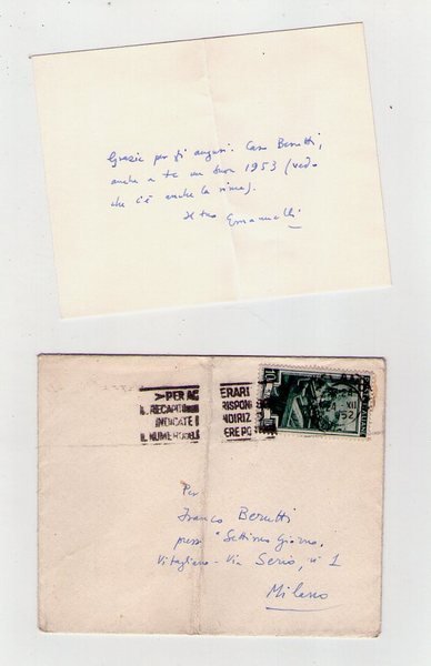 biglietto completo di busta manoscritto e firmato dello scrittore Enrico Emanulli datato 24 Dicembre 1952; biglietto di auguri spedito a Franco Berutti; buon es.
