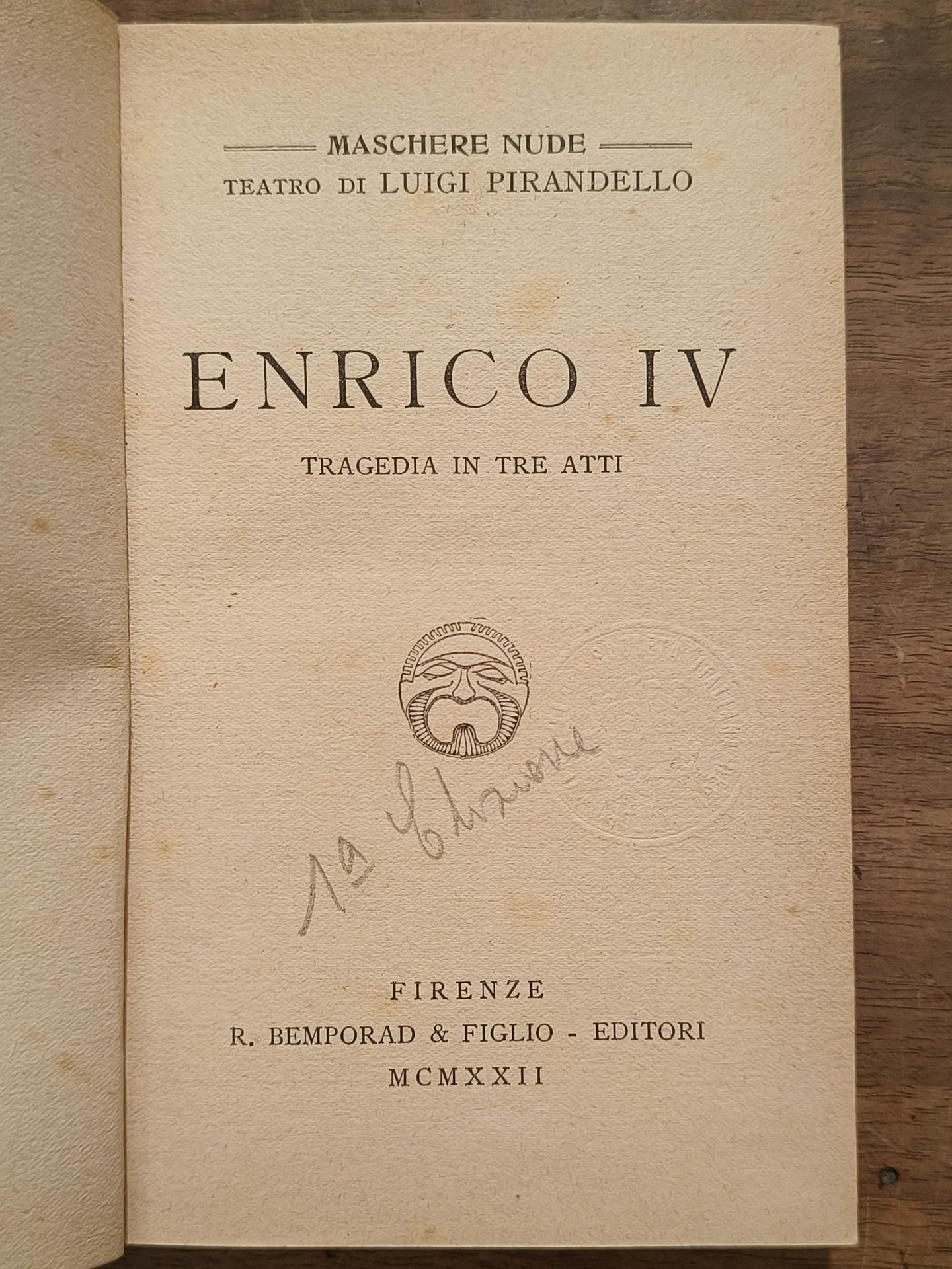 Enrico IV. Tragedia in tre atti, Firenze, Bempoard, 1922. Prima edizione. Cm 17,4. Pp. (4) 140. Legatura in mezza tela rossa con carta colorata marrone. Qualche macchia alla legatura, carte leggermente brunite. Serie maschere nude. Teatro di Luigi Pirandello.