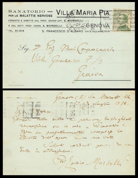 cartolina del Sanatorio Villa Maria Pia di Genova manoscritta e firmata di Enrico Morselli (uno degli esponenti più attivi della psichiatria italiana) datata Luglio 1926; ottimo es.