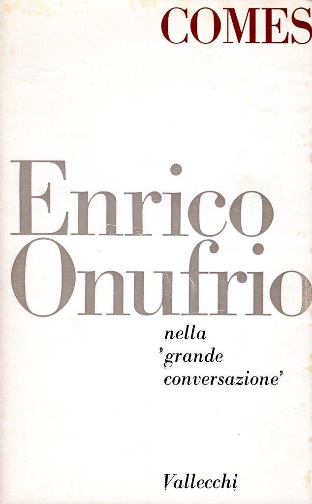 Enrico Onufrio nella grande conversazione, prima edizione aprile 1969, pp. 211, formato 12,5 x 20.<BR>Copertina morbida di colore celeste con titoli in nero al piatto anteriore e sul dorso. Sovraccoperta di colore bianco con titoli in grigio e marrone. In prima pagina presente dedica dell'autore allo scrittore Enrico Vallecchi, datata febbraio 1970. <BR>Ottime condizioni.