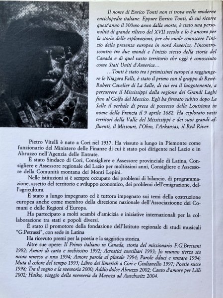 La presenza italiana in Canada e negli Stati Uniti è stata sin dalle origini decisiva per la penetrazione europea nell'entroterra nordamericano. Enrico Tonti è un saggio storico, la biografia di un personaggio storico fondamentale per i primi insediamenti europei nel Nordamerica.