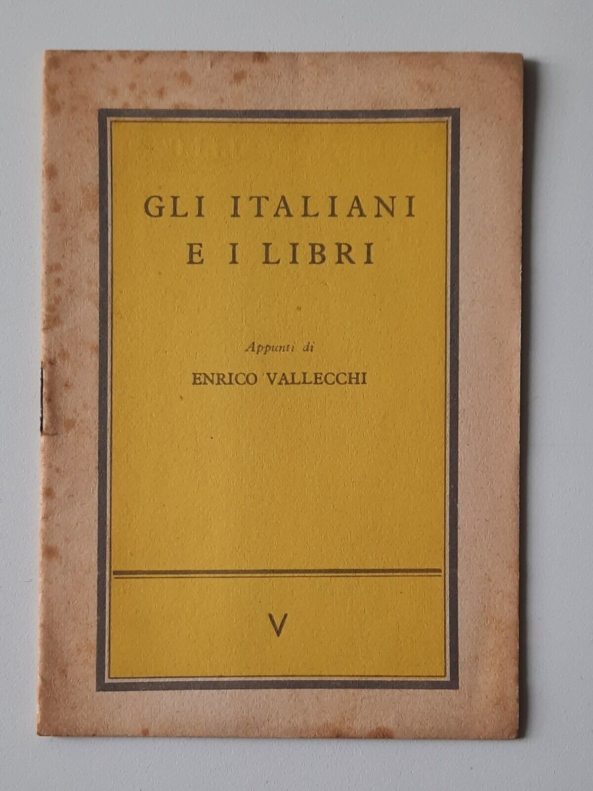 ENRICO VALLECCHI GLI ITALIANI E I LIBRI VALLECCHI 1954In 12°, pag. 18, legatura editoriale con graffetta, copertina illustrata, .Piccole macchie alla copertina.