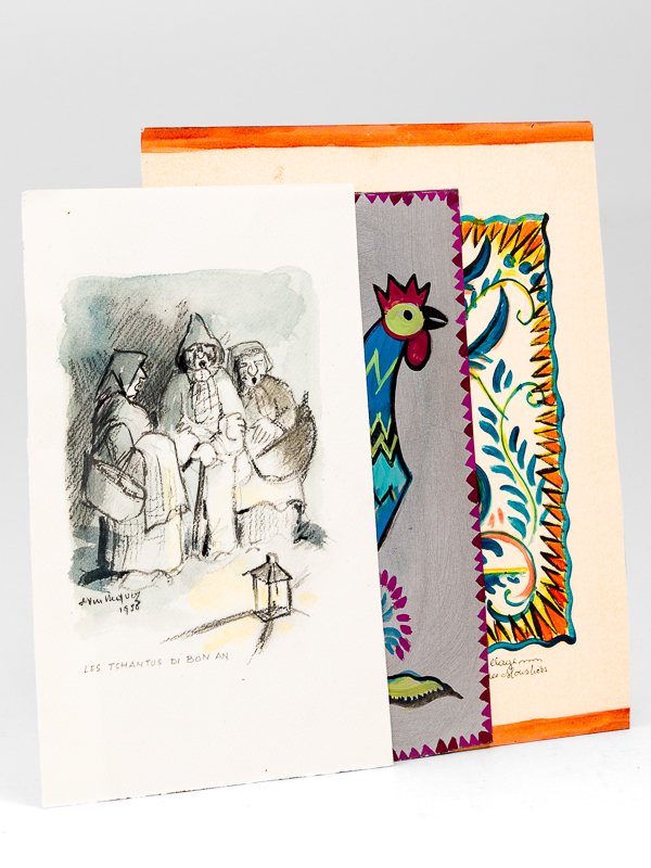 Ensemble de 3 aquarelles et peinture : "Les Tchantus di Bon An" - "Le Coq de Mon Village Vu par un Potier des Moustiers" - Coq