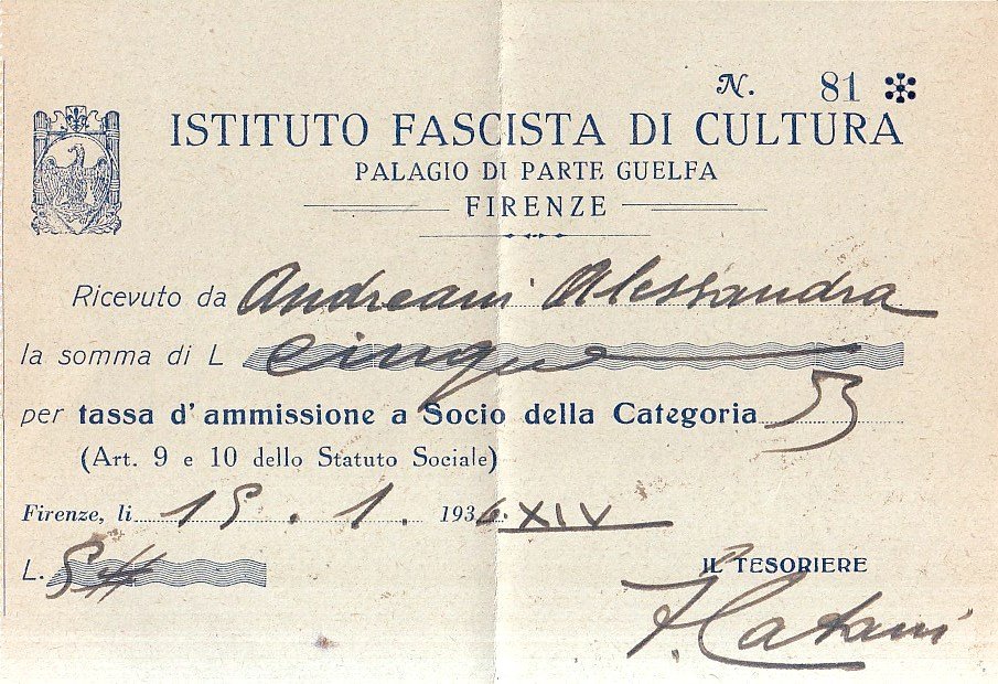 Brossura originale rilegata a punto metallico, 14 pagine col testo dello Statuto; acclusa ricevuta di pagamento di Lire 5 per tassa d'ammissione a Socio della Categoria B come descritta all'Art. 10 del suddetto, datato e firmato dall'allora Tesoriere dell'Istituto Fascista di Cultura. L'opuscolo presenta solo un piccolo numero scritto in rosso al piatto, peraltro il tutto risulta in ottimo stato di conservazione.