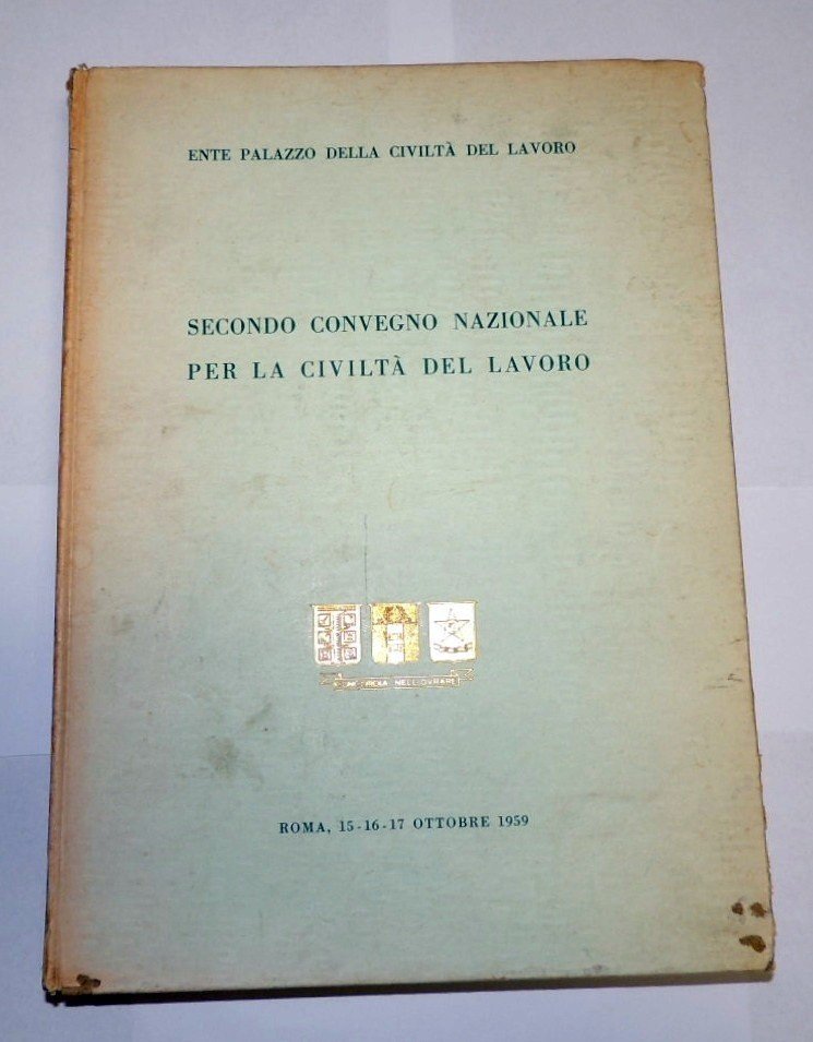 Ente Palazzo della Civiltà del Lavoro, Secondo convegno nazionale per la civiltà del lavoro. Educazione alla socialità del lavoro, Roma 15-16-17 ottobre 1959, s.n., s.l. s.d. (Staderini, Roma 1959?), pp. 319, 7 tavv. f.t. ill. b.n., cm 29, cart. ed. In testa al frontespizio: Ente palazzo della Civiltà del Lavoro - Federazione Nazionale dei Cavalieri del Lavoro - Federazione dei Maestri del Lavoro d'Italia - Associazione Naz. Lavoratori Anziani d'Azienda. Volume redatto a cura di Francesco Mandillo con la collaborazione di Alberto Marinelli e Gianni Letta. Indice: Prefazione – Il Palazzo della Civiltà del Lavoro e il Secondo Convegno Nazionale – Tavole del Lavoro – Ente Palazzo della Civiltà del Lavoro. Consiglio di Amministrazione - Secondo Convegno Nazionale per la Civiltà del Lavoro (Presidenza del Convegno - Presidenti e relatori delle due tornate - Relatore coordinatore - Segreteria del Convegno) – La seduta inaugurale alla presenza del Capo dello Stato (Il saluto del Sindaco di Roma – Il Saluto del Presidente della Federazione dei Maestri del Lavoro - Il Saluto del Presidente della Associazione Nazionale Lavoratori Anziani d’Azienda – La prolusione inaugurale del Presidente dell’ Ente Palazzo della Civiltà del Lavoro, Cavaliere del Lavoro Enrico Pozzani – Il discorso del Ministro per l’Industria e il Commercio, On. Emilio Colombo – La consegna delle onorificenze ai nuovi Cavalieri del Lavoro – L’udienza particolare del Sommo Pontefice Giovanni XXIII) – Tornata sociologica: I. Le relazioni ufficiali presentate (A. Marinelli, San Benedetto e la moderna socialità del Lavoro – C. Curcio, Profilo storico della socialità del lavoro – U. Baldini, Problemi derivanti dalla diversa velocità del progresso tecnologico rispetto ai conseguenti adeguamenti sociali – M. C. Segrè, Evoluzione delle condizioni di lavoro nell’industria e prospettive future – A. Marzi, Psicologia del gruppo di lavoro – A. Miotto, Gli aspetti negativi del lavoro nell’industria – E. Fulchignoni, Efficacia e pericoli dei grandi mezzi di comunicazione – R. Chiodelli, L’educazione e le comunicazioni di massa – L. Pignone, La socialità istintiva e la socialità meditata nel mondo lavoro) – II. Le comunicazioni scritte presentate - III. Lo svolgimento del dibattito (C. Pellizzi, Conclusione della tornata) – Tornata pedagogica: I. Le relazioni ufficiali presentate (P. Filiasi-Carcano, Recenti sviluppi delle scienze umane – C. Verde, Dell’esigenza preliminare di chiarire il concetto di persona – P. D’Alessandro, Formazione umana e preparazione tecnica alla socialità del lavoro – A. Gattuso, Crisi della spiritualità nel mondo del lavoro – G. Martinoli, L’educazione nell’azienda e per l’azienda – G. Gozzer, Formazione umana e professionale del lavoratore – L. Volpicelli, Educazione e lavoro) – II. Le comunicazioni scritte presentate – III. Lo svolgimento del dibattito (F. Franceschini, Conclusione della tornata) – La seduta conclusiva (Il discorso del Ministro degli Esteri Giuseppe Pella – Le linee conclusive esposte dal Relatore Coordinatore – Il saluto del Presidente Enrico Pozzani) – Considerazioni e proposte emerse dal Convegno – Indice dei nomi. Tracce d'uso ai piatti e segni di umidità al dorso, ma interno buono.