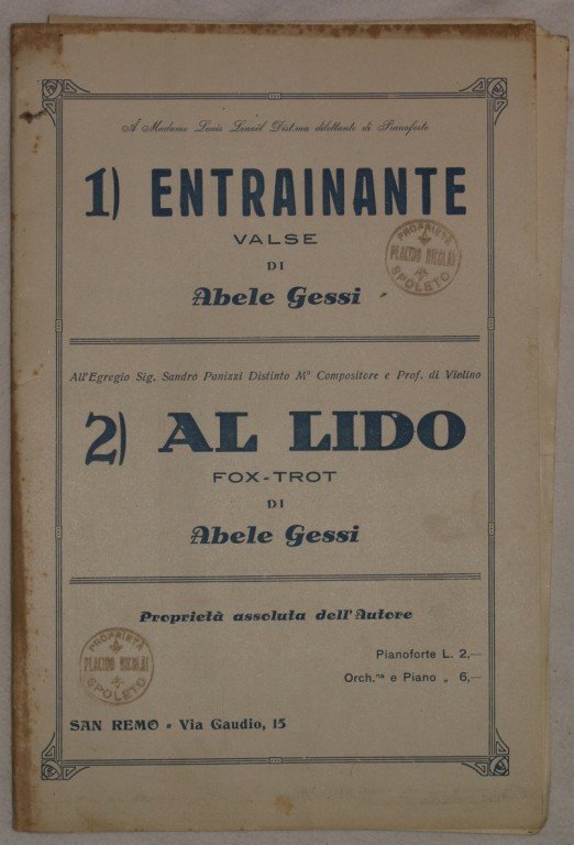 In 8. cm 26,5x17,5. Pp. 14. Partitura completa per orchestra del 1934 di due canzoni. Caratteristica copertina decorata dell'epoca. Ex libris sulla copertina. Buone condizioni; bruniture; segno di nastro adesivo alla seconda pagina. A complete score for orchestra of 1934. Carachteristic decorated cover of that period. Ex libris in the cover. Good conditions, yellowings; sign of adhesive tape in the second page.