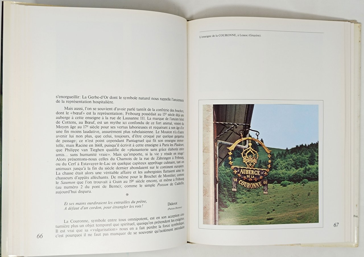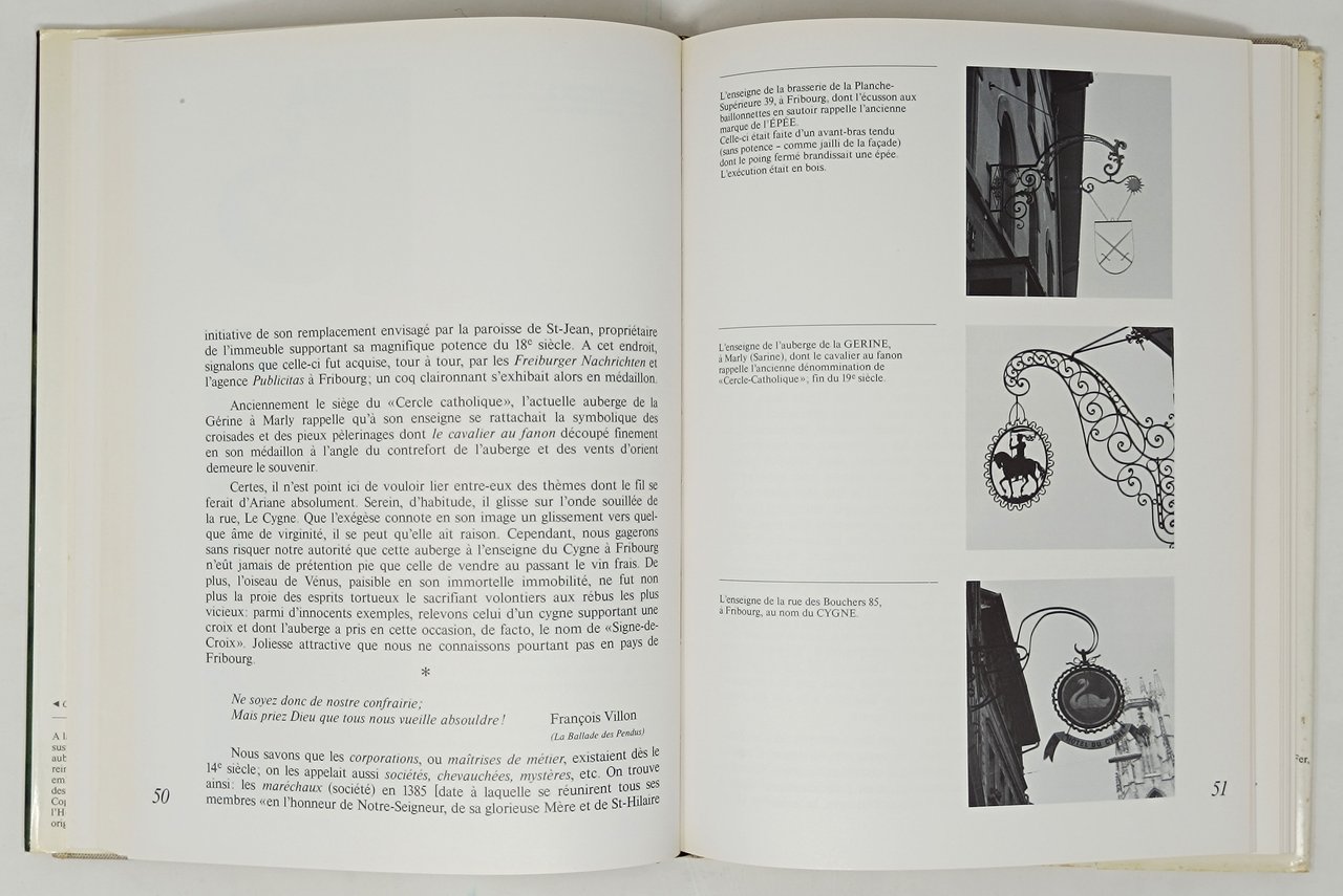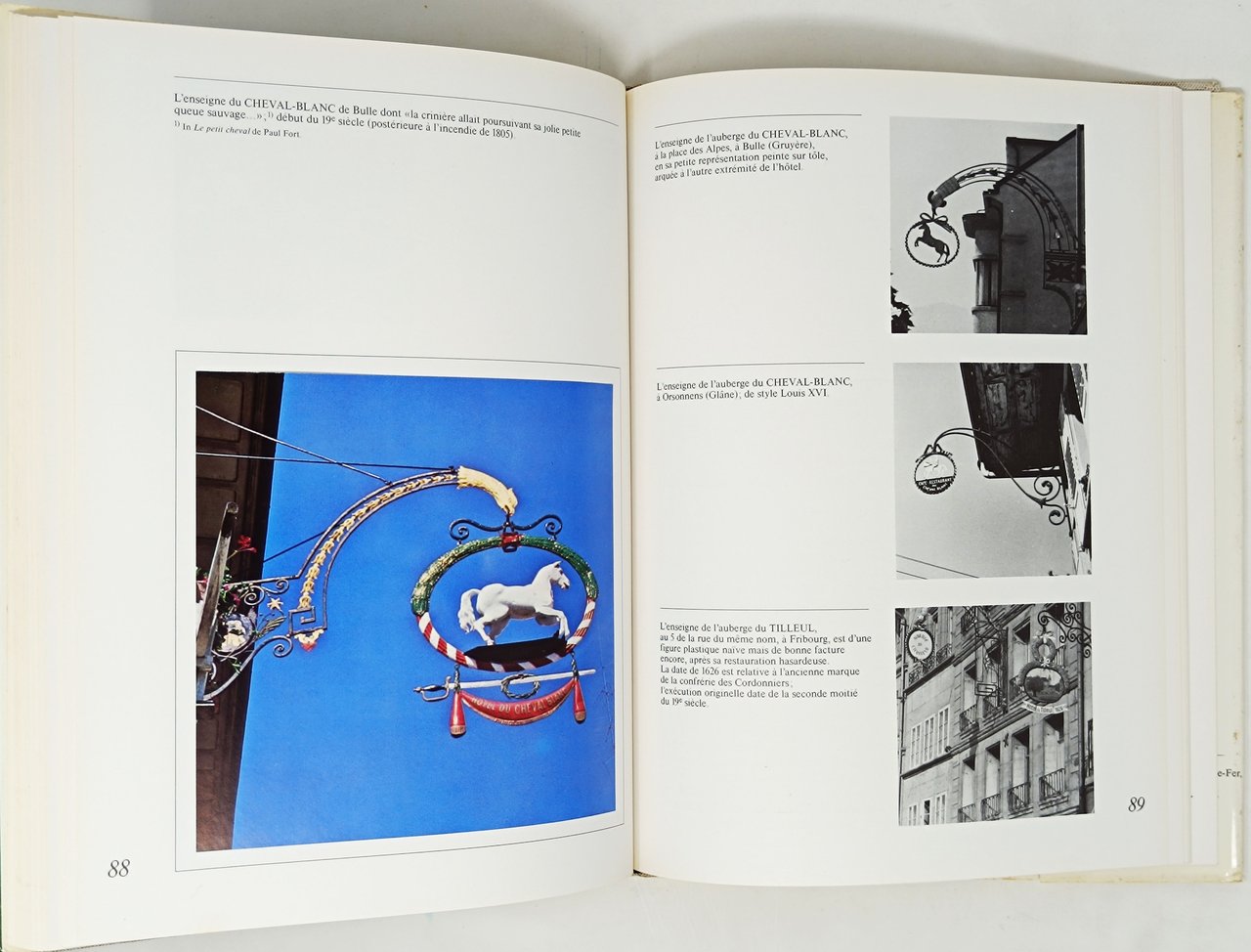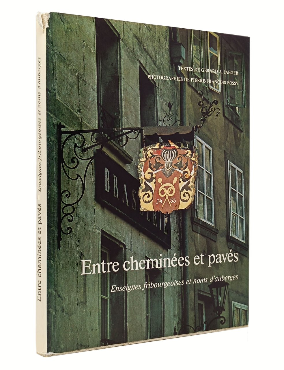 Textes de Gerard A. Jaeger. Photographies de Pierre-Francois Bossy. Préface d'Etienne Chatton (consarvateur des monuments historiques). Editions Le Cassetin. Curioso studio (corredato da un ampio apparato iconografico) delle insegne e dei nomi degli alberghi di Friburgo. Lingua del testo: francese. non datato. Formato: 22 x 28,5 cm circa. 119 pagine. Numerose illustrazioni fotografice delle varie insegne albergiere in nero nel testo e immagini fotografice a colori applicate sulle pagine. Stato di conservazione: si segnala esclusivamente un piccolo strappetto sul margine superiore del dorso della sovraccoperta ma, nel complesso, un esemplare decisamente buono. Con una dedica a pennarello nero, sulla pagina del titolo, datata 3/12/1976 dell'autore del testo Gerard A. Jaeger.