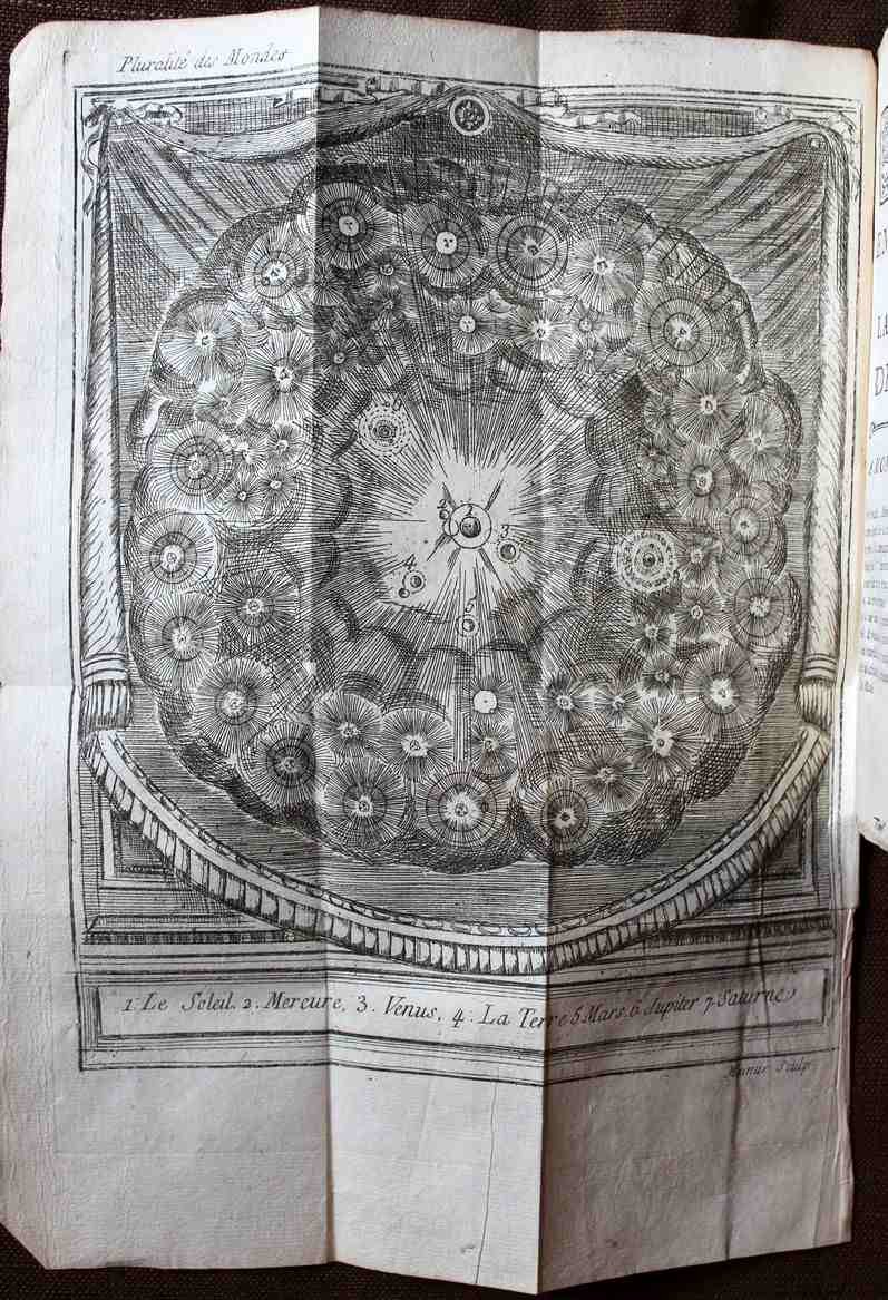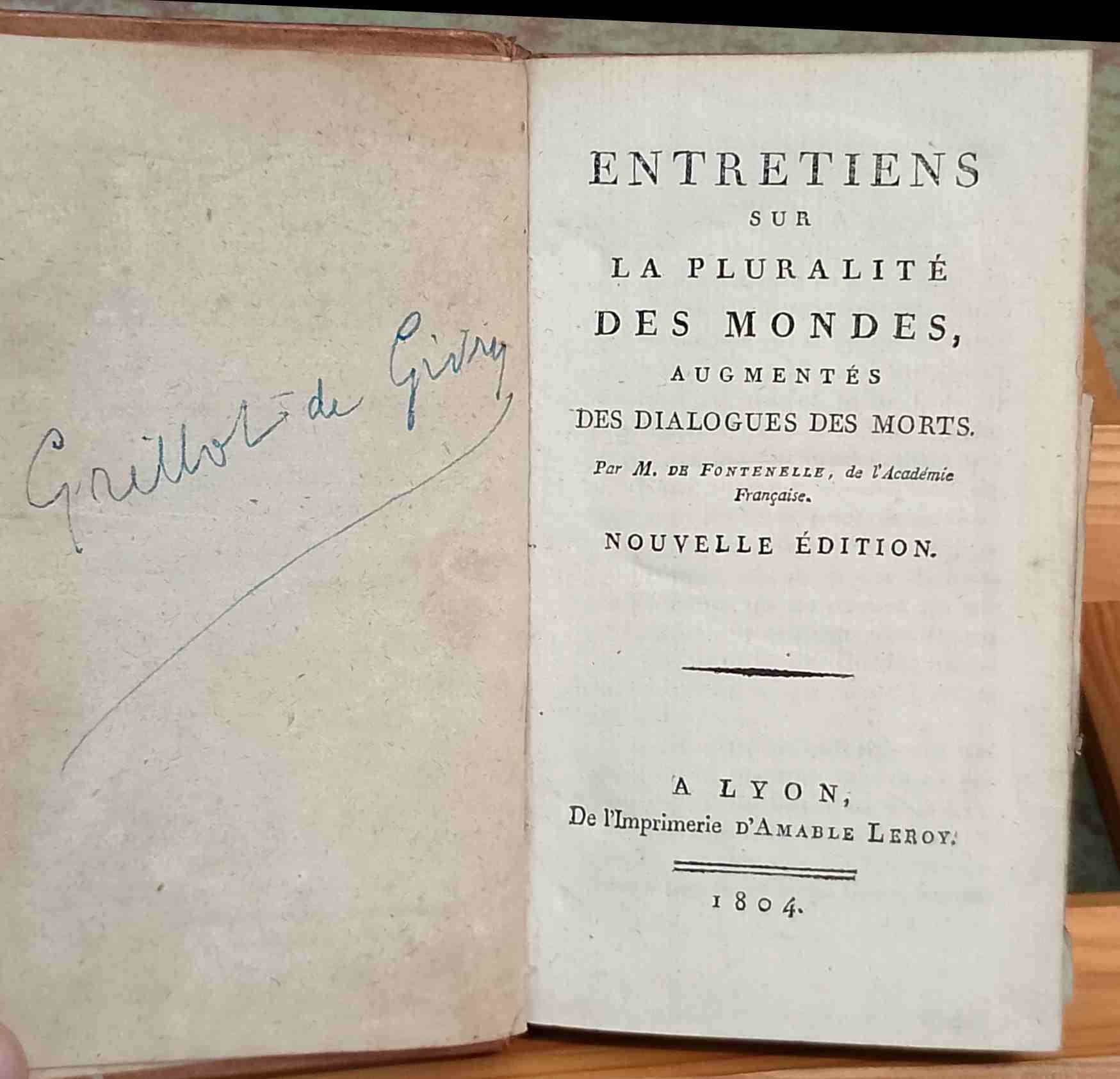 In 12°, pp. xii, (2), 394. Con una tavola ripiegata raffigurante il sistema solare (inc. da Meunier). Piena pelle dell'epoca. Dorso liscio con fregi, filetti oro. Titoli su tassello (un po' sciupato). Tagli marmorizzati. Copia molto buona. Bernard Le Bovier de Fontenelle (Rouen 1657 - Paris 1757) nipote del grande drammaturgo Pierre Corneille, viene accolto all'Académie française nel 1691. Segretario perpetuo dell'Académie des Sciences fu il fondatore dell'Académie de Rouen. I suoi Entretiens sur la pluralité des mondes costituirono per molto tempo lo strumento principale di discussione e di diffusione della fisica cartesiana nella società francese. Volume appartenuto al celebre esoterista francese Émile Grillot de Givry, con il suo autografo sulla carta di guardia.