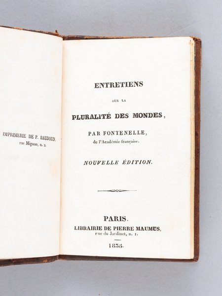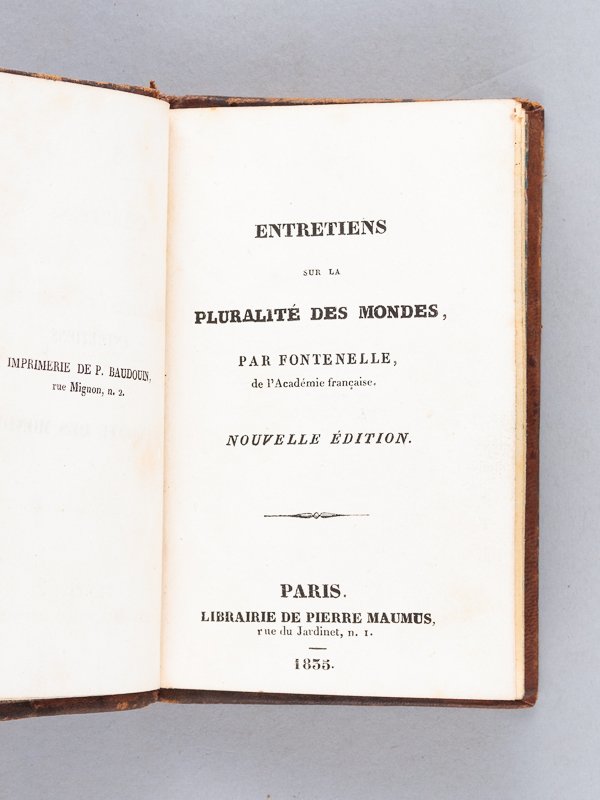 Nouvelle Edition, 1 vol. in-12 reliure de l'époque pleine basane mouchetée, tranches marbrées, Librairie de Pierre Maumus, Paris, 1835, 2 ff., 206 pp. Etat très satisfaisant (rel. frottée, petite taches à un f.) pour cette édition tardive mais peu commune.