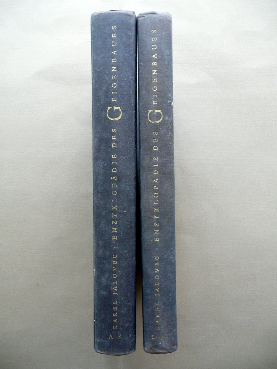 Karel Jalovec, Enzyklopadie des Geigenbaues Volume I - II (opera completa in due volumi) Artia, Praha 1965; cm 30,5x23,5; pp. 492 (volume I), pp. 424 (volume II), entrambi con numerosissime ill. in b/n nel t. e fuori t., e qualche tavola a col. fuori t.; tutta tela ed. con titolo impresso in oro al dorso e al piatto ant. Opera completa in due volumi. Testo in tedesco. Condizioni di conservazione Volumi entrambi ben conservati con tracce d'uso, coperte con alcuni leggeri aloni, lievi tracce di sporco e minimi strappetti. Interni ottimi; solamente pp. 491-92 del volume I con traccia di piega. Opera completa in due volumi. Testo in tedesco. SETT134.L13355 N