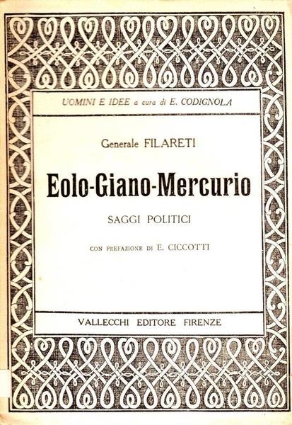 Eolo - Giano - Mercurio, edizione 1922, pp. 97, formato 14 x 19,5.<BR>Copertina morbida illustrata con titoli in nero al piatto anteriore e sul dorso.Prefazione di E. Ciccotti. Volume facente parte della collana Uomini e Idee a cura di E. Codignola. <BR>Condizioni molto buone.