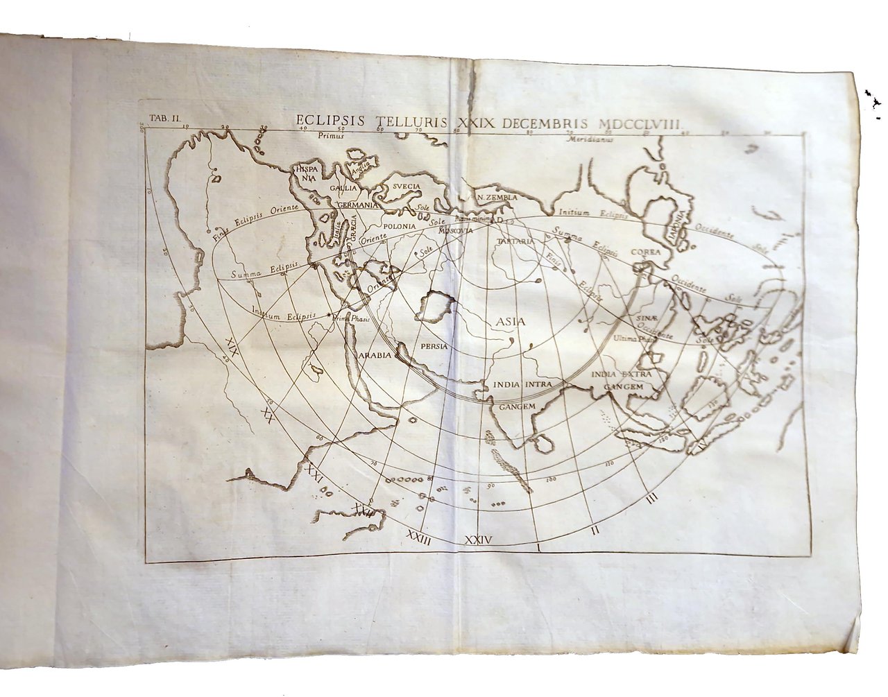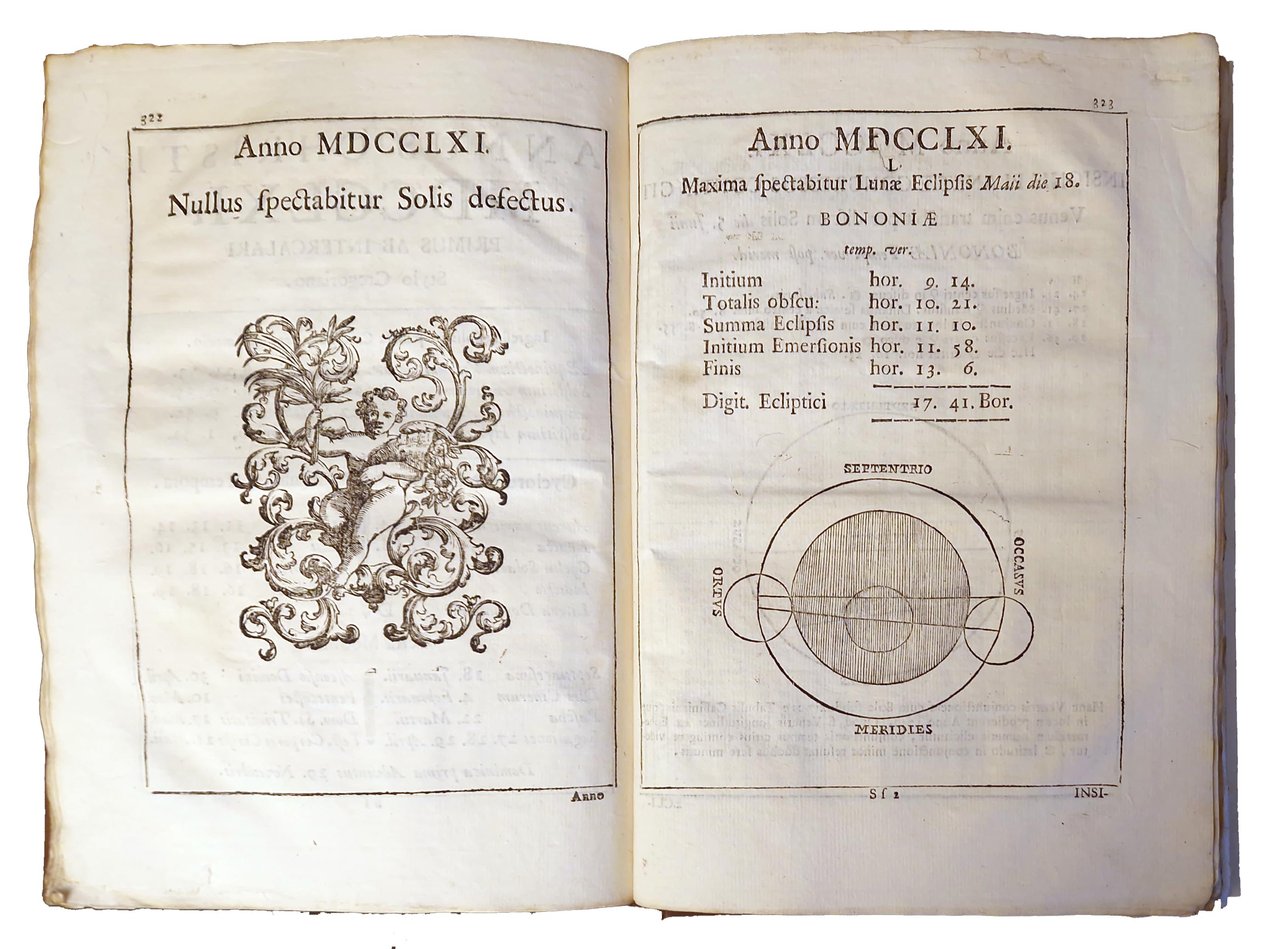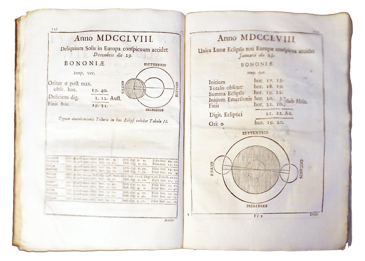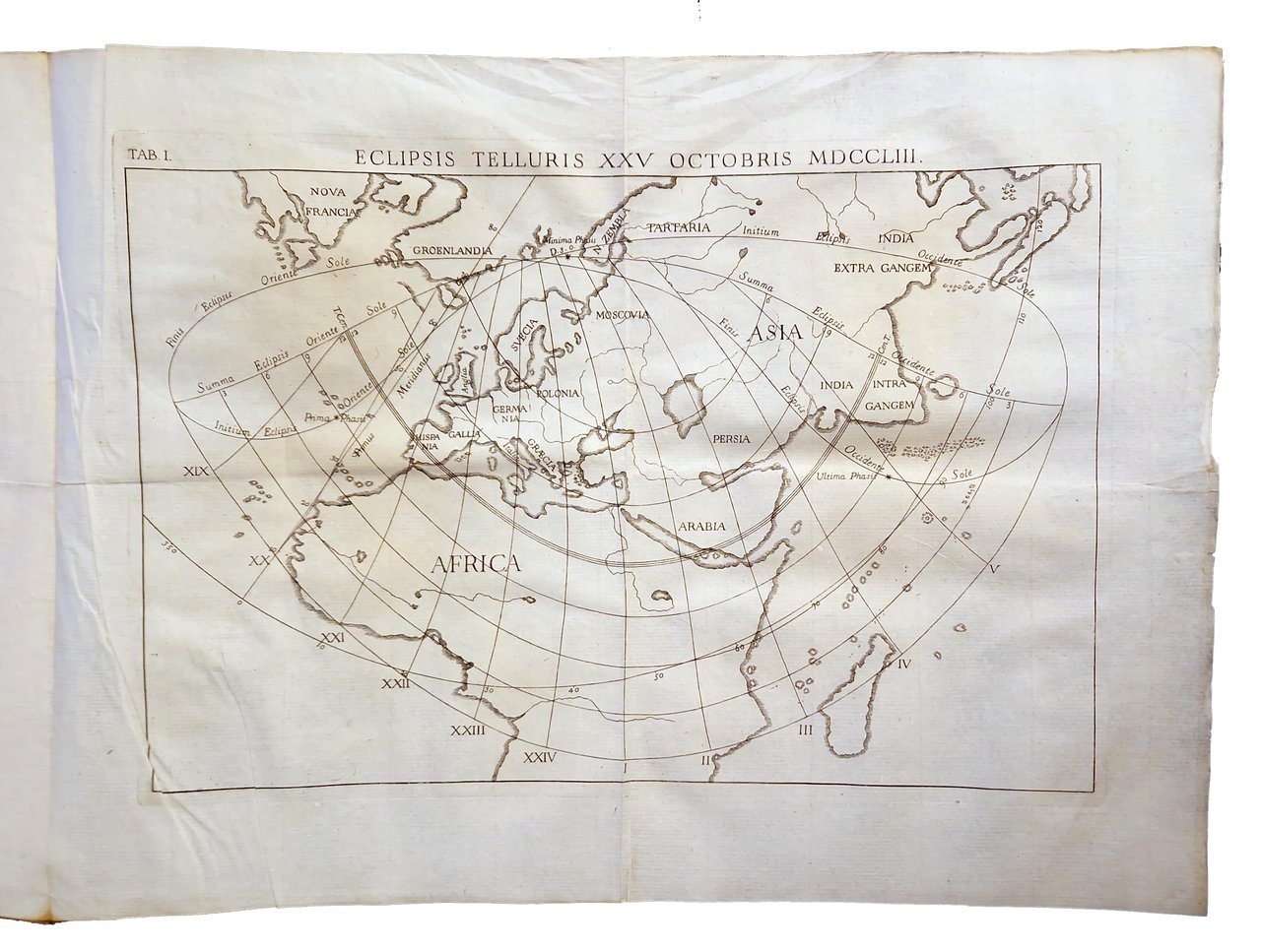 in-4°, 282x202 mm, leg. moderna in cartonato muto; pp. [12], 383, [1], IV c. di tav. ripiegate. Fregio xilogr. sul frontespizio. Numerose vignette ed illlustrazioni di carattere astronomico nel testo e 4 tavole ripiegate geografiche rappresentanti le parti del mondo in cui si resero visibili le eclissi. Raccolta delle effemeridi riferite al meridiano di Bologna nel periodo dal 1751 al 1762, a cura di Eustachio Zanotti (1709-1782), astronomo e ingegnere bolognese. Rif.: IT\ICCU\UFIE\003457. OCLC, 883699409. Cond.: Legatura molto buona. Carte abbastanza pulite, con occasionali bruniture. Esemplare molto buono.