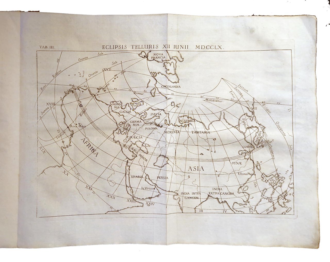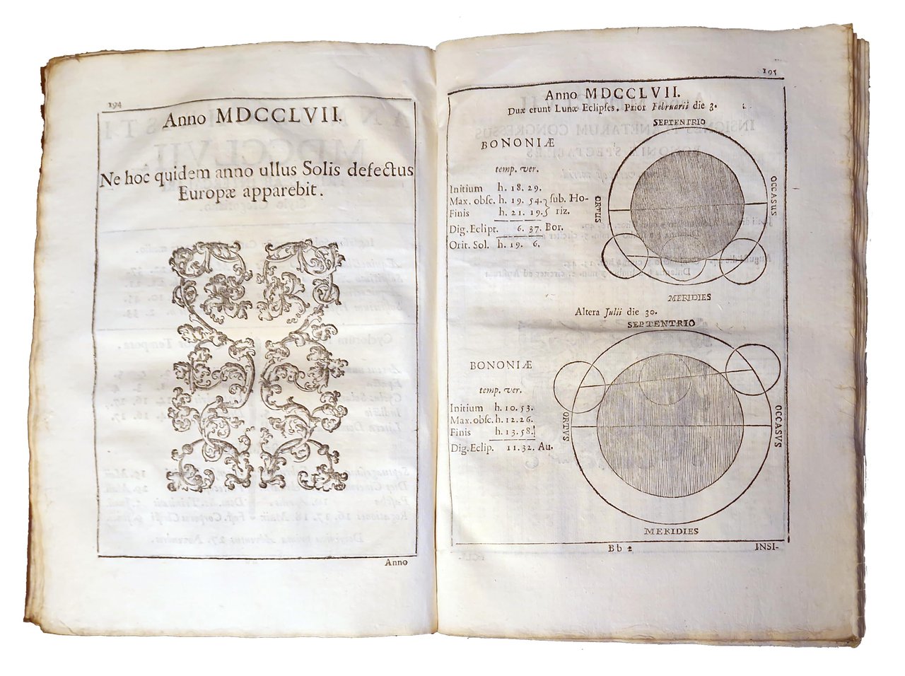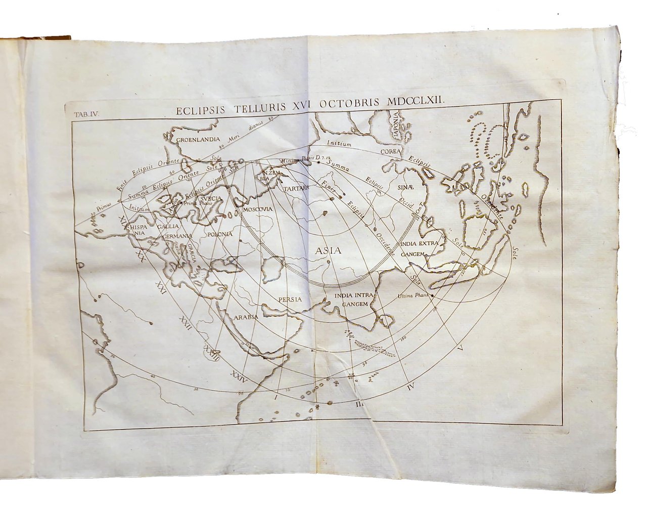 in-4°, 282x202 mm, leg. moderna in cartonato muto; pp. [12], 383, [1], IV c. di tav. ripiegate. Fregio xilogr. sul frontespizio. Numerose vignette ed illlustrazioni di carattere astronomico nel testo e 4 tavole ripiegate geografiche rappresentanti le parti del mondo in cui si resero visibili le eclissi. Raccolta delle effemeridi riferite al meridiano di Bologna nel periodo dal 1751 al 1762, a cura di Eustachio Zanotti (1709-1782), astronomo e ingegnere bolognese. Rif.: IT\ICCU\UFIE\003457. OCLC, 883699409. Cond.: Legatura molto buona. Carte abbastanza pulite, con occasionali bruniture. Esemplare molto buono.