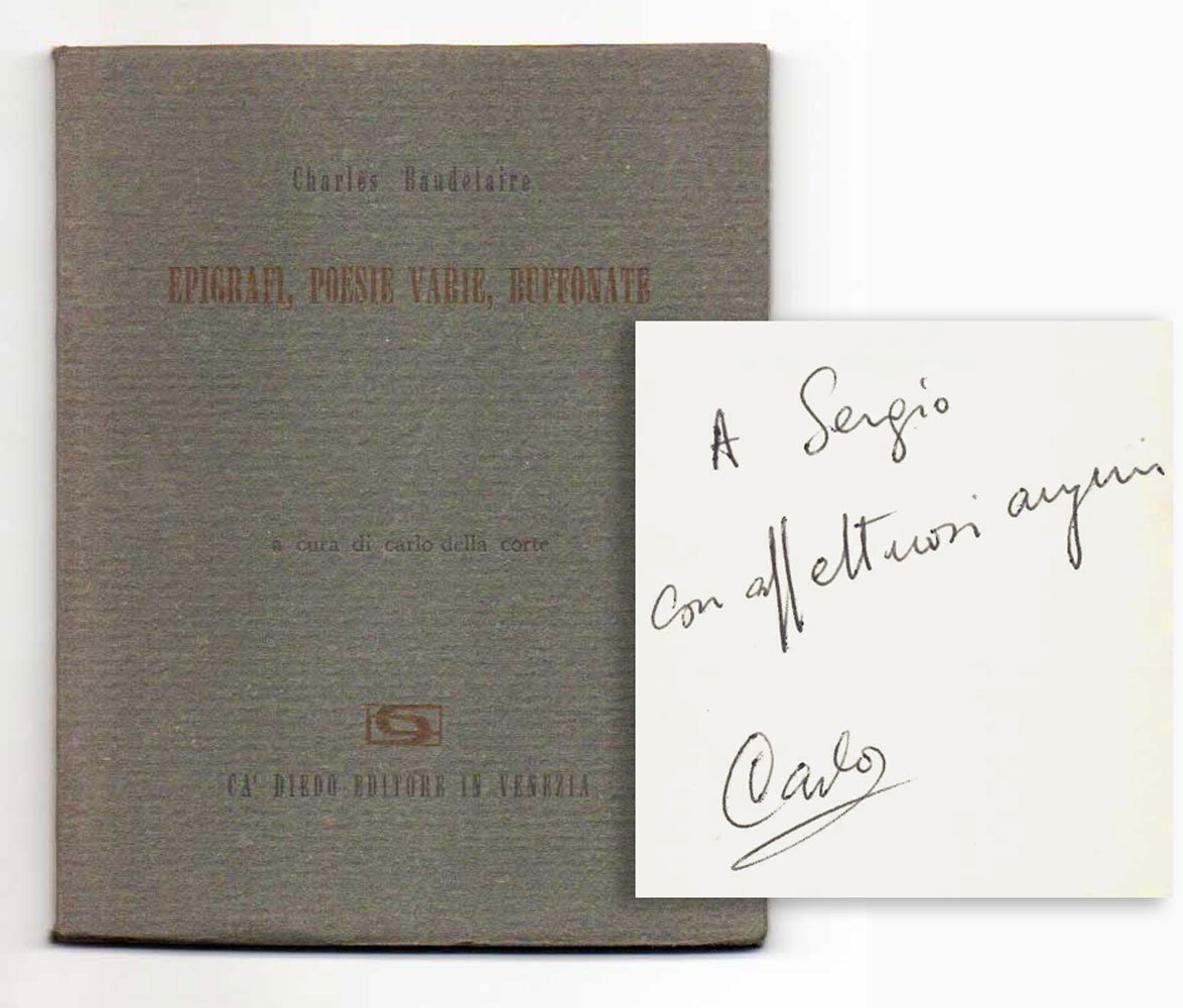 LIBROPrima edizione.CON AUTOGRAFO.Esemplare 95 di soli 100 numerati, in ottime condizioni. Dedica autografa del traduttore a Sergio Pautasso, critico letterario ed editor Rizzoli.Rarissima raccolta di versi di Baudelaire tirata in soli cento esemplari numerati come strenna per il capodanno 1960. Cura e traduzione di Carlo Della Corte (1930-2000), che firma anche la breve prefazione: giornalista televisivo e intellettuale, corrispose con i maggiori scrittori e poeti del medio Novecento italiano.