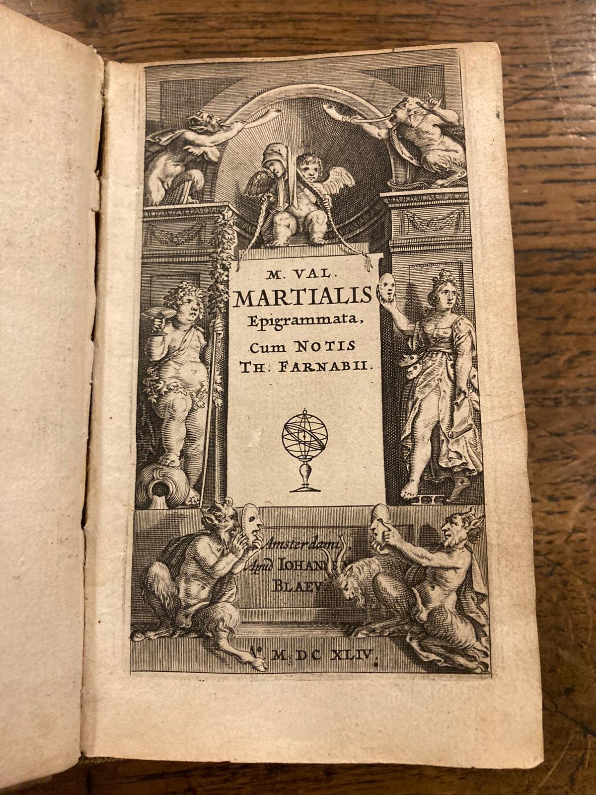 In-12° (13.8x8.5 cm), piena pergamena rigida strettamente coeva con unghie, nervetti passanti al dorso con tracce di titolo manoscritto. Pp (2) bianche, 492, frontespizio allegorico finemente inciso su rame, capolèttere incisi (alcuni animati). Ex libris di Noel Pinelli applicato al contropiatto anteriore. Bell'esemplare fresco e genuino. Non comune ed elegante edizione olandese (prima ed., 1615 Londra) degli epigrammi di Marziale col commento del grammatico, classicista e insegnante Thomas Farnaby (1575-1647). Un ampio commento è posto in calce a ogni epigramma. Precedono il testo dedicatoria a stampa a Robert Killigrew (1580-1633) ambasciatore britannico presso le Province Unite (Pre-Netherlands), una breve biografia di Marziale scritta dal Crinito ed una introduzione per i lettori.