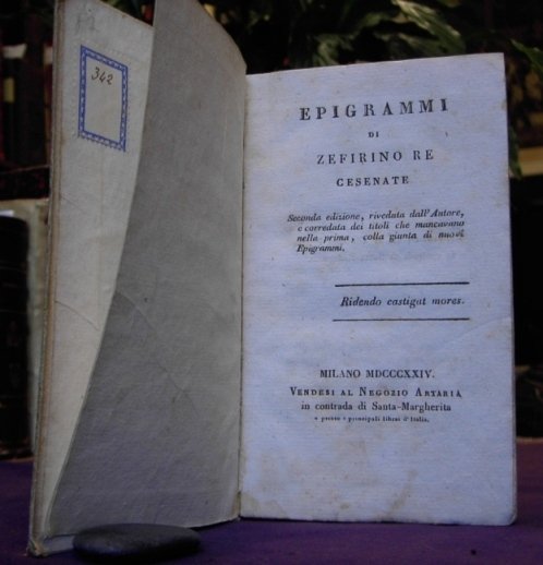 Volume in 24 legato con brossura in cartoncino rigido, sguardie, frontespizio, indice, 72 pp. Eleganti e dilettevoli epigrammi sicuramente rivolti a persone ben conosciute, graffiante 'ad libitum'. Un esempio: 'Tien la Veterinaria Aulo in non cale:/ E come guarir se gli vien male?'. Piacevole anche per le dimensioni, bello stato di conservazione, legatura postuma, carta vergata e frusciante, deliziosamente poco comune.