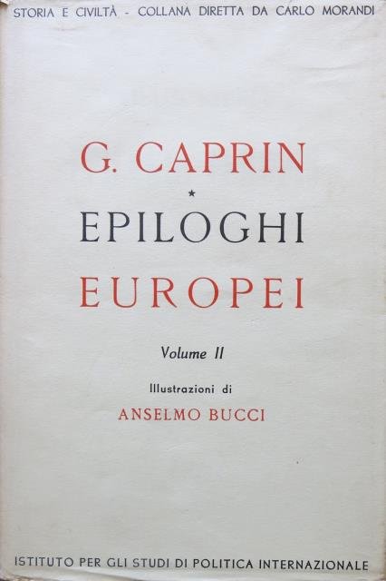 Istituto per gli Studi di Politica Internazionale, Milano, 1941 – XX. "Storia e Civiltà", collana diretta da Carlo Morandi. Illustrazioni di Anselmo Bucci. Due voll. in 8vo, pp. 271 + 2 di Indice, 24 illustrazioni in nero nel testo e 8 tricromie fuori di testo di Anselmo Bucci; 289 + 2 di Indice, 22 illustrazioni in nero nel testo e 8 tricromie fuori testo di Anselmo Bucci, leg. edit. in cartonato con sovracoperta con titoli in rosso / nero. Ottimo saggio sui viaggi dello scrittore e giornalista triestino (Trieste 1880 - Firenze 1958) composto dopo l'entrata dell'Italia nella prima guerra mondiale: ricordi dei suoi viaggi compiuti in tutta Europa. Un po' di foxing e ingiallimento, brunito il taglio superiore, buono stato.