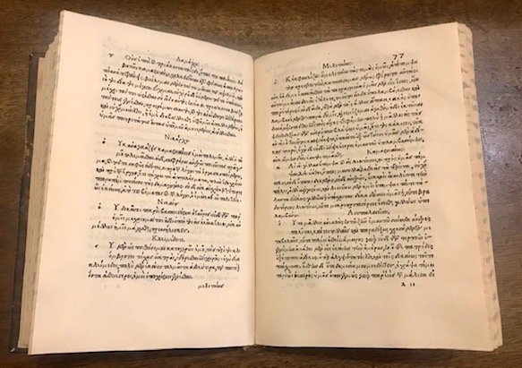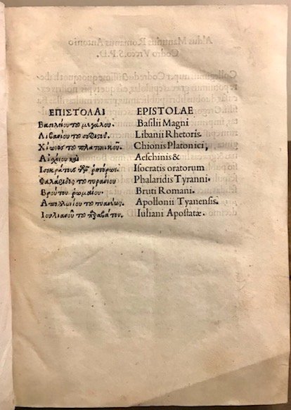 4to (cm. 20,3), 137 cc.nn. (ma numerazione anticamente ms.), 1 c.nn. bianca. Testo in greco. Legatura settecentesca in piena pelle maculata. Nervi e ricchi fregi oro al ds. Tagli screziati. Esemplare di assoluta freschezza ed in eccellente stato di conservazione. Seconda parte (di due) dell’Editio princeps della grande maggioranza di autori greci di epistole pubblicata per cura di Marco Musuro e impressa con i meravigliosi caratteri greci della stamperia aldina. Nella sua dedicatoria ad Antonio Urceo Codro (1446-1500), professore di greco e latino a Bologna, Aldo afferma di aver raccolto tutte le lettere che riuscì a procurarsi di circa trentacinque scrittori greci. Nei due volumi furono però inserite le lettere di soli 26 autori. Quelli che non compaiono in questa edizione erano riservati per una pubblicazione successiva che non vide mai la luce. Scrivere lettere era considerata un’arte che faceva parte a pieno titolo dell’educazione umanistica e dunque gli epistolari circolavano come modelli. L’importanza ed il contenuto delle epistole presenti in quest’opera va, tuttavia, ben oltre l’aspetto prettamente stilistico. Renouard, p. 18; Hain-Copinger, 6659; Goff, E-64.