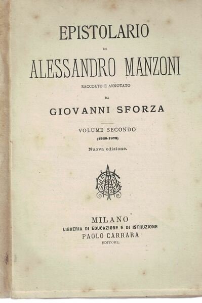 Epistolario di Alessandro Manzoni raccolto e annotato da Giovanni Sforza. Volume Secondo (1840-1878). Nuova edizione. Milano Libreria di educazione e di istruzione. Paolo Carrara Editore, 1883.