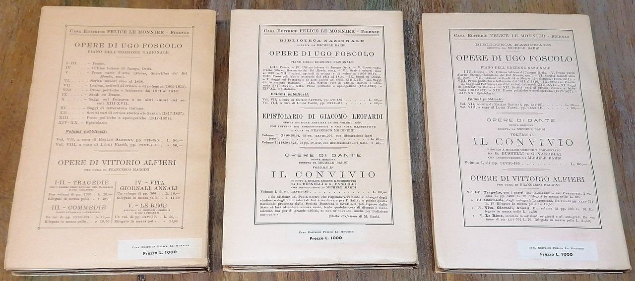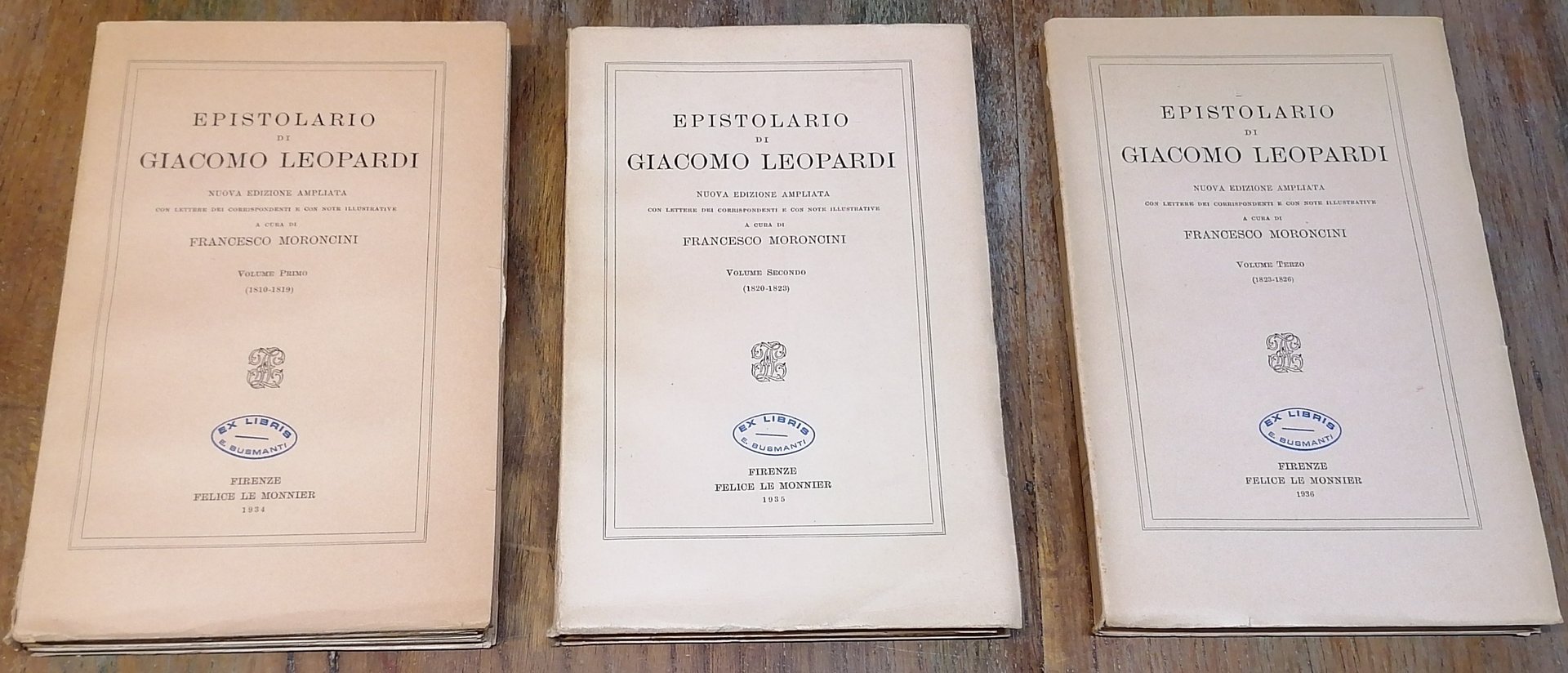 Tre volumi in 8°, brossure editoriali. Volume primo : 1934, Lettere 1-243 degli anni 1810-1819, pp. XXVII,(1),334,(2). Volume secondo : 1935, Lettere 244-527 degli anni 1820-1823, pp. (4),310,(2). Volume terzo : 1936, Lettere 528-786 degli anni 1823-1826, pp. (4),298,(2). I volumi sono corredati da tavole fuori testo con ritratti di Giacomo Leopardi e dei suoi corrispondenti. Piccolo ex libris a timbro su copertine anteriori e frontespizi. I primi tre volumi dell'edizione curata da Francesco Moroncini in sette tomi edita da Le Monnier tra il 1934 e il 1941. Ottimo stato di conservazione.