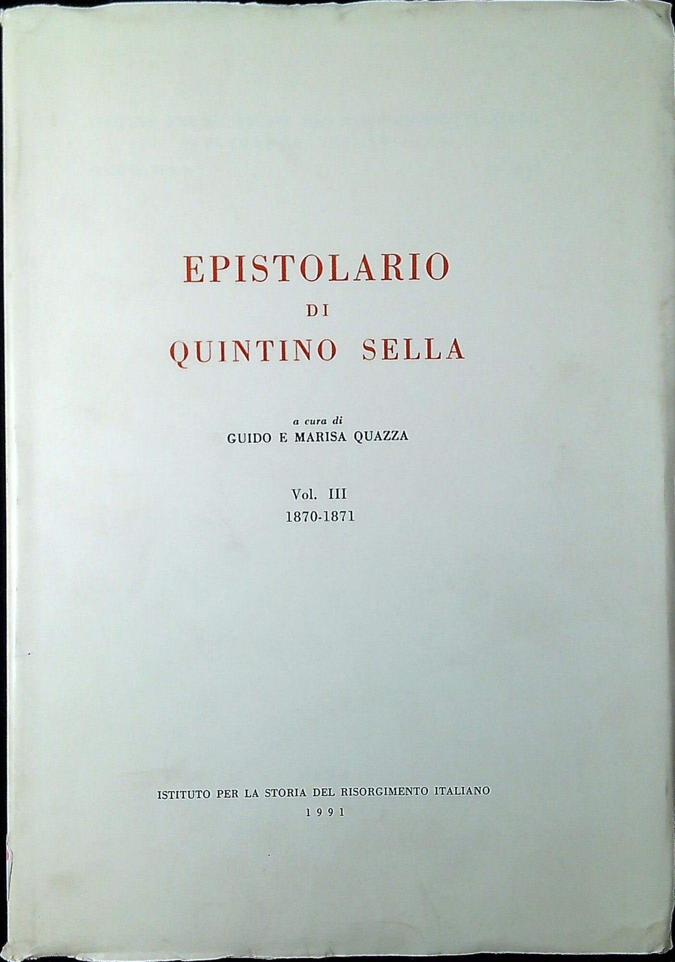 Epistolario di Quintino Sella. Vol. 3: 1870-187. Roma, Istituto per la storia del Risorgimento italiano 1991, VIII, 790 p., \1! c. di tav. ; 26 cm. (69452)