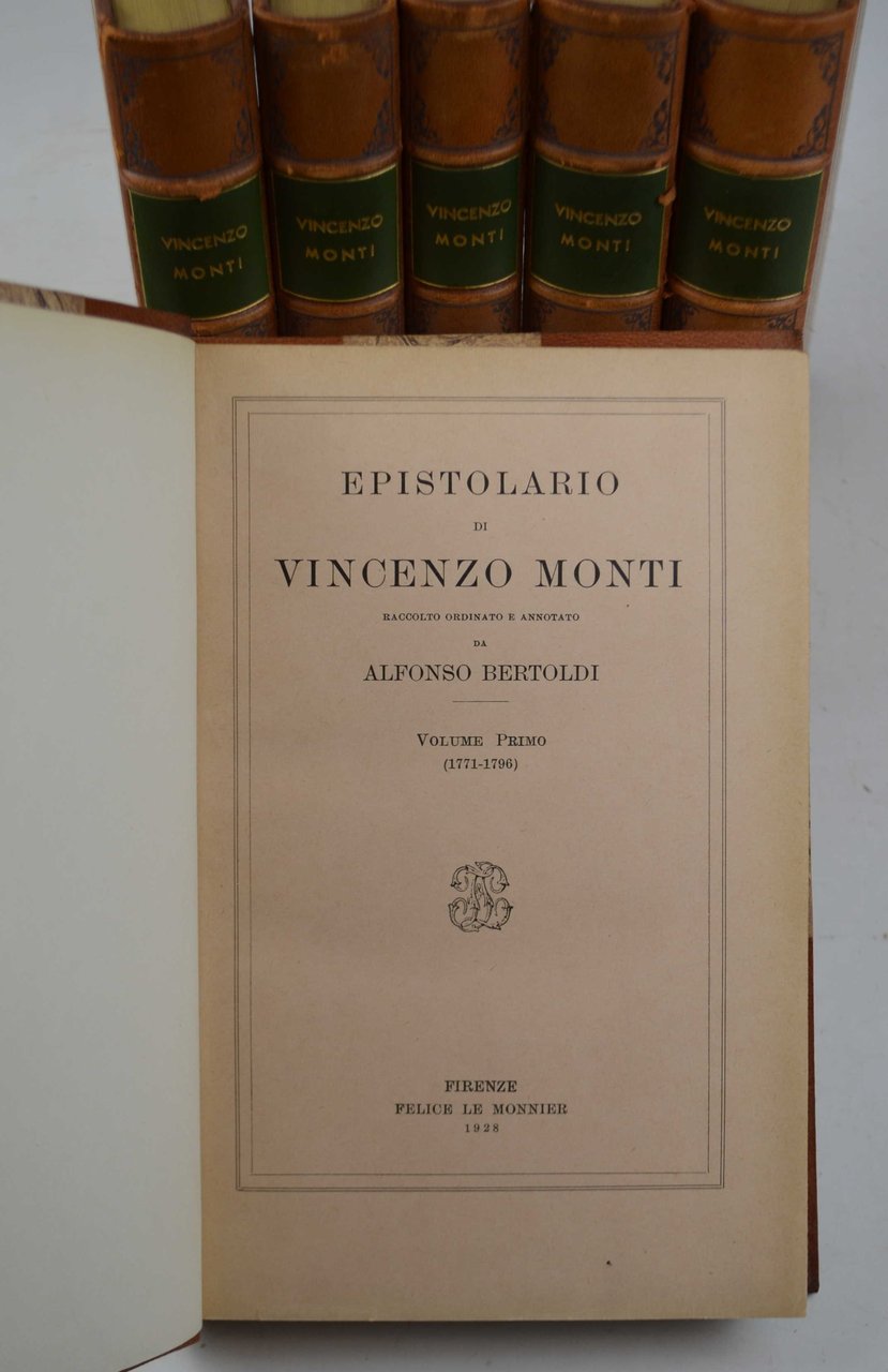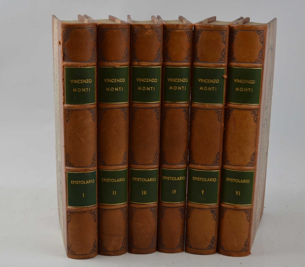 Sei volumi di cm. 24, pp. 3.000 ca. complessive. Solida ed elegante legatura del tempo in mezza pelle con ampie punte, dorsi a nervi con fregi e titoli in oro su doppi tasselli. Tagli di testa dorati. Preservata all'interno la bross. orig. ornata. Esemplare in ottimo stato di conservazione.